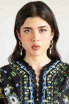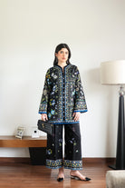 This striking black outfit is adorned with a vibrant mix of colorful floral and geometric patterns in shades of blue, yellow, green, and pink. The tunic features wide sleeves and a distinctive scalloped blue and black edge at the hem. The matching trousers also display scattered floral designs and a patterned border, creating a cohesive and artistic look.