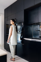 Step into understated elegance with this breezy sleeveless ivory ensemble, delicately embroidered with powder blue floral motifs. The shirt features a scalloped hem and neckline, accentuated with intricate thread-work that exudes feminine charm. Paired with a matching tapered trouser, adorned with scattered blue embroidery, this outfit is the epitome of effortless summer style. Perfect for daytime lounging or casual meetups, it offers a refreshing palette and relaxed silhouette, all while staying refined and chic.