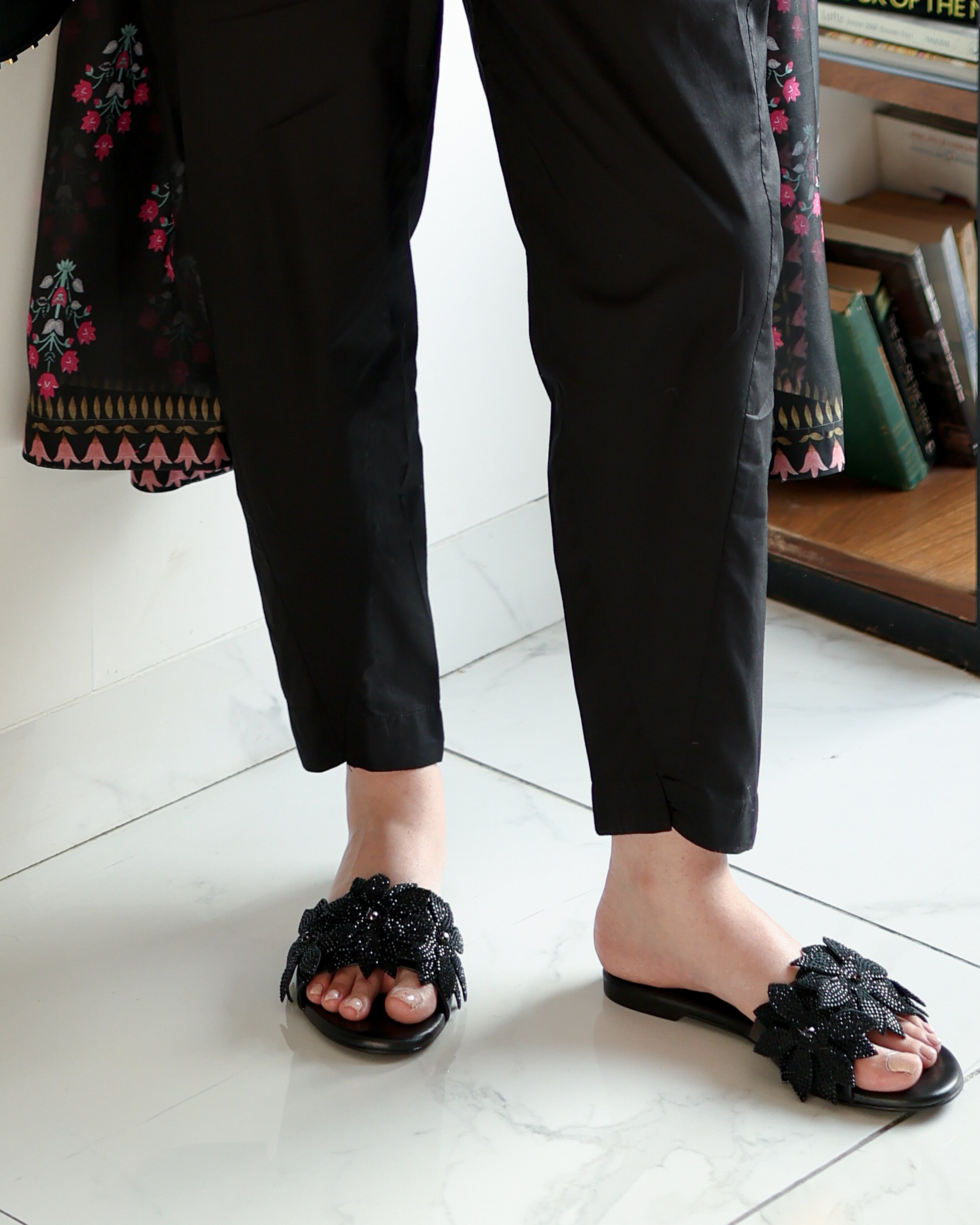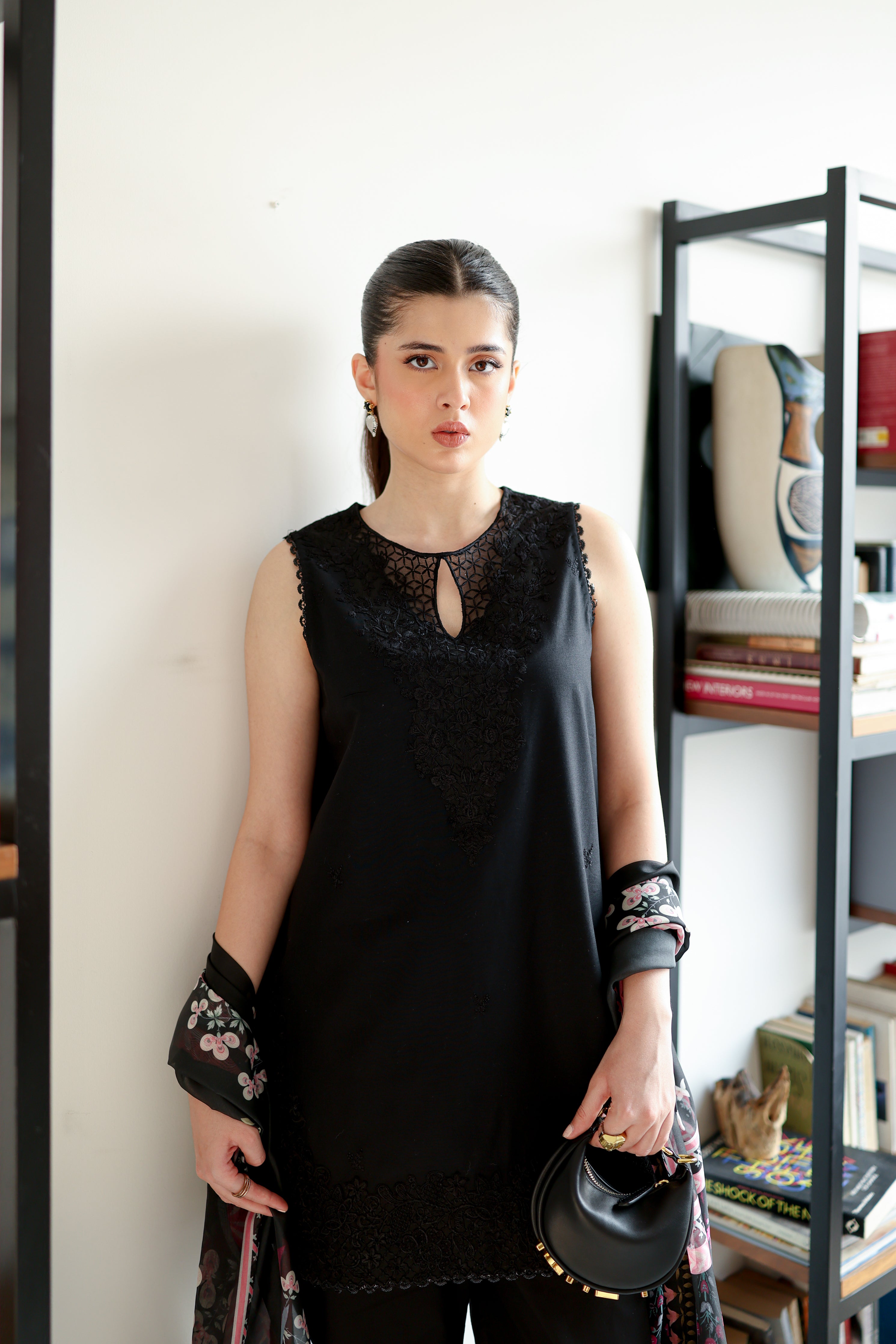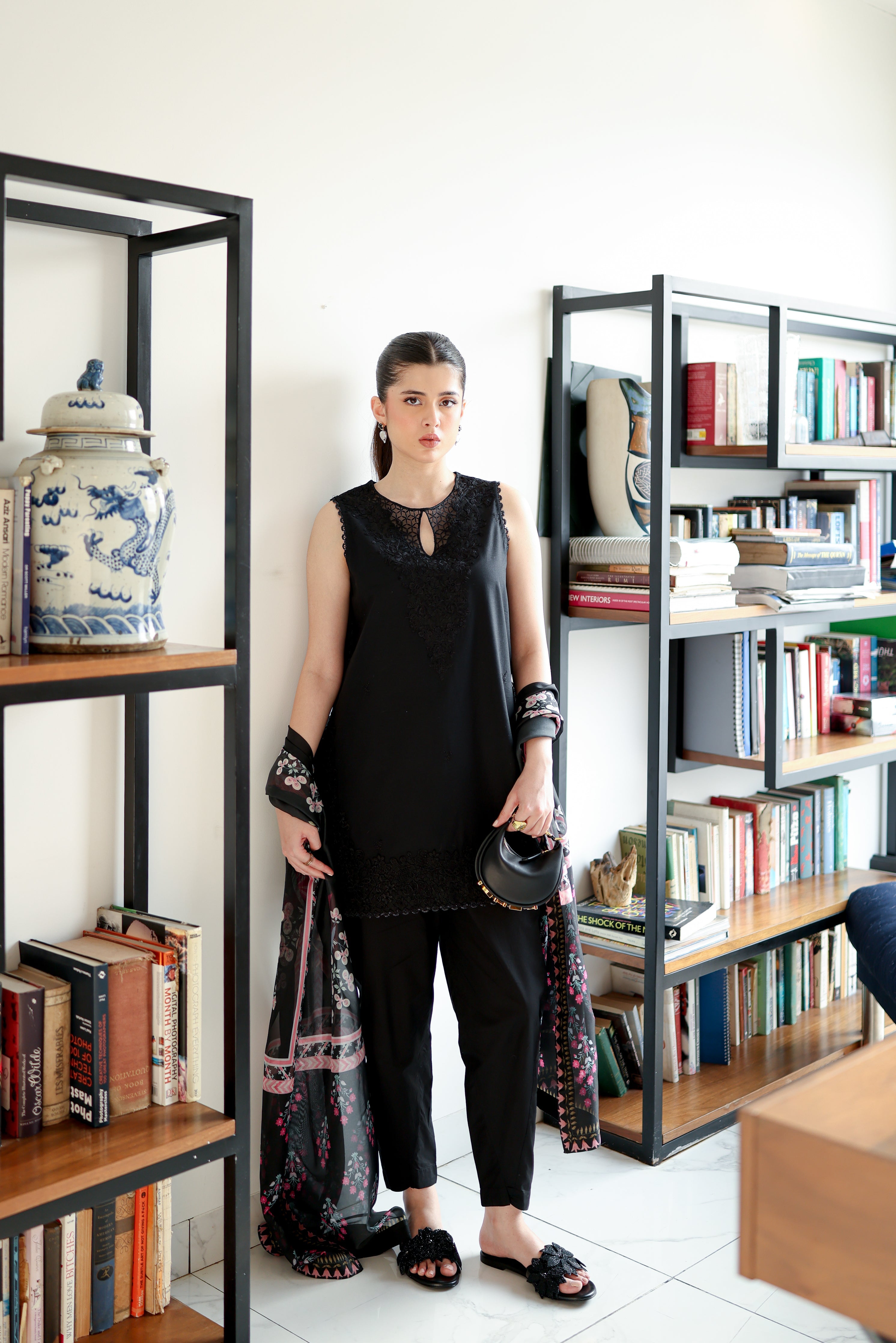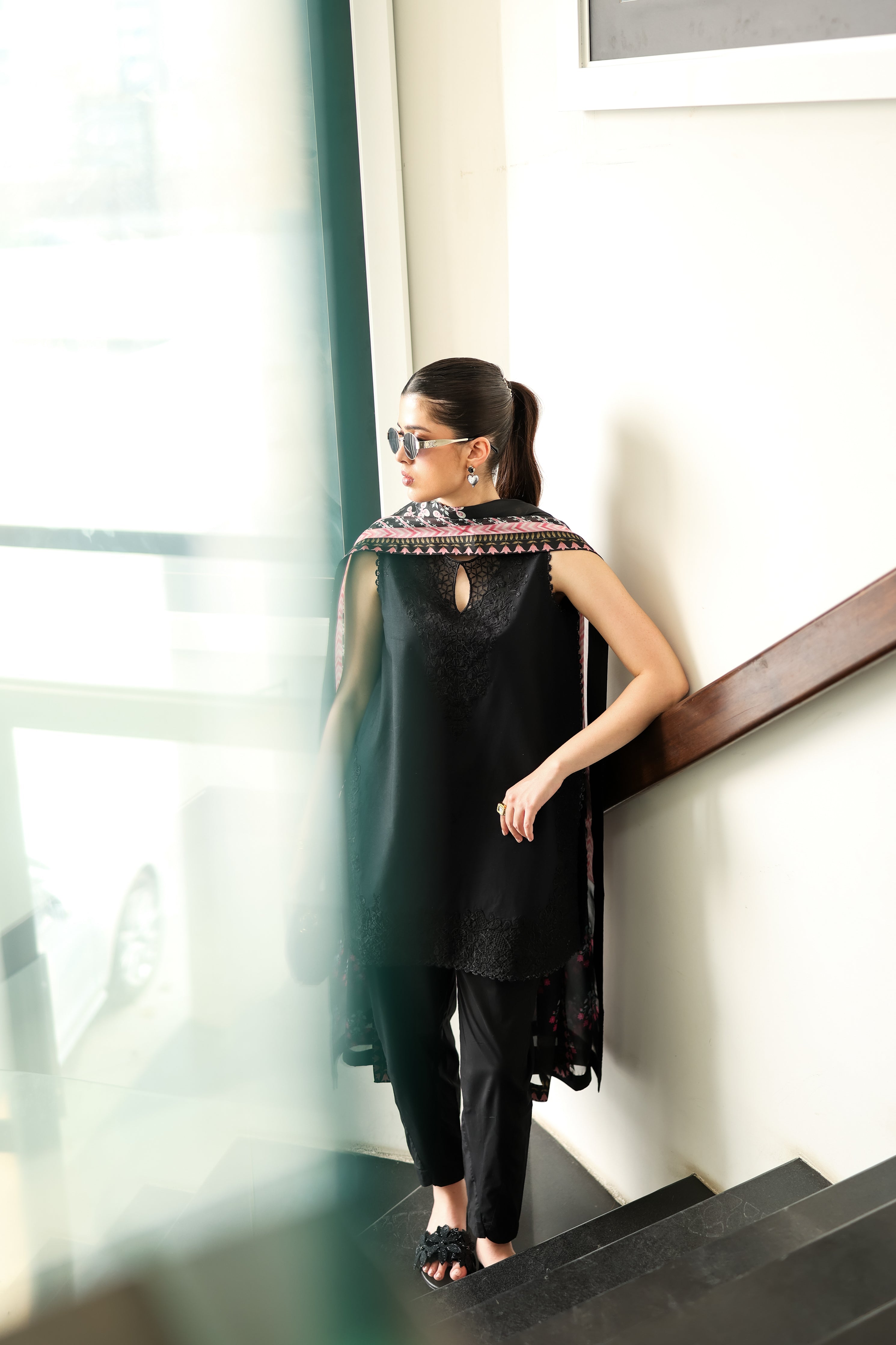 An elegant jet black outfit featuring a sleeveless/or with sleeves straight shirt enhanced with intricate tonal embroidery along the neckline and hem. The keyhole neckline adds a hint of modern chic, while the delicate threadwork gives the shirt a refined texture. It is paired with straight black trousers for a clean, polished silhouette. The look is elevated by a digitally printed chiffon dupatta, adorned with floral motifs in pink, ivory, and olive tones, framed by geometric and floral borders. This ensemble strikes the perfect balance between classic elegance and contemporary flair, ideal for both daytime gatherings and evening wear.