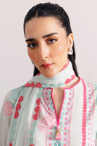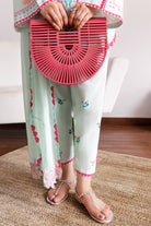 This refreshing three-piece ensemble is set on a soft mint green base, vibrant with intricate folk-art inspired prints. The tunic features a central printed motif of stylized florals and leaves in shades of pink, blue, and coral, flanked by printed pink and aqua geometric borders and a playful scalloped heart-shaped trim in hot pink along the hem. The wide sleeves mirror the geometric border print design, also outlined in hot pink. The matching straight trousers are adorned with delicate small floral prints, and their hems echo the hot pink scalloped trim of the tunic. A coordinating embroidered mint green dupatta with hot pink edges completes this cheerful and artistic look.