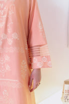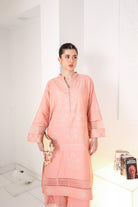 This charming two piece ensemble features a soothing light peach hue, exuding understated elegance. The tunic is adorned with intricate ivory embroidery in geometric and floral patterns, particularly prominent around the V-neckline, extending down the front, and forming decorative borders on the wide, relaxed sleeves. A distinctive design element on the sleeves and the lower hem of the tunic includes horizontal sheer or semi-sheer fabric panels, adding a contemporary and airy touch. The coordinating straight trousers are elegantly finished with a wide off-white lace trim at the hem, creating a beautiful contrast and adding a delicate, feminine detail to the solid peach fabric.