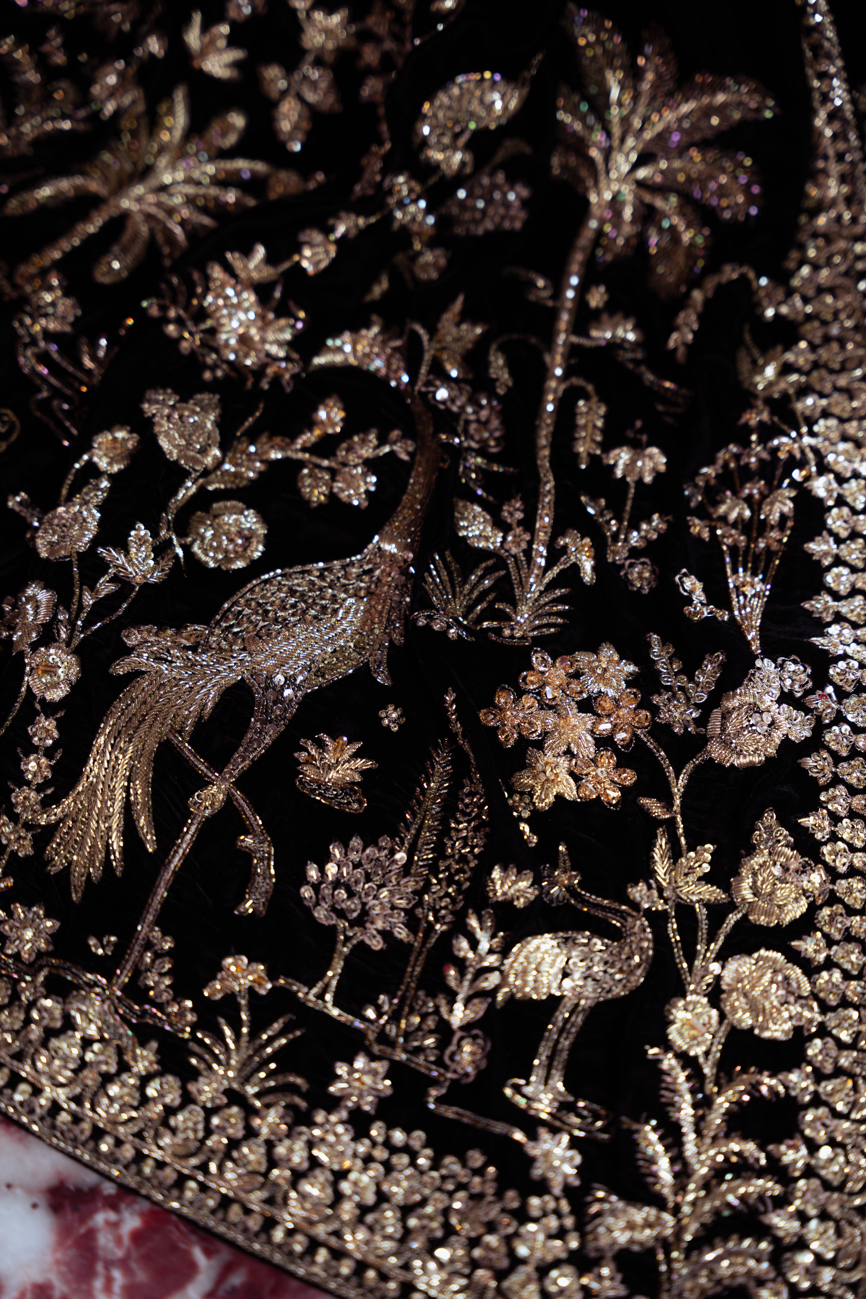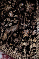 This black velvet saree is a true statement of luxury, featuring a rich, graceful drape that enhances its sophisticated charm. The antique-gold embroidered borders add a refined sparkle, giving the saree a regal and timeless appeal. Its heavily embellished pallu creates a grand, flowing look perfect for formal evenings and special events. Paired with a sleek velvet blouse, the ensemble beautifully balances modern minimalism with classic elegance. The deep black tone and intricate detailing make it ideal for weddings, receptions, and festive celebrations. Overall, this saree offers an unforgettable blend of opulence, finesse, and contemporary style.