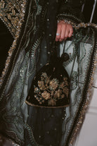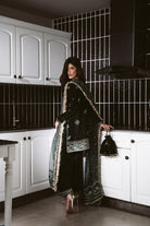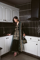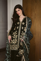 This luxurious emerald velvet formal ensemble features a richly adorned long shirt embellished with intricate gold zari, sequins, and threadwork, creating a striking contrast against the deep green base. The front is beautifully detailed with elaborate floral and vine motifs, seamlessly extending to the hemline for a regal finish. Paired with matching velvet trousers, the outfit maintains a cohesive and sophisticated look. The organza dupatta enhances the overall elegance, showcasing delicate embroidered borders, scattered pearl accents, and graceful wave patterns that add dimension and charm. Crafted with exquisite craftsmanship and premium materials, this ensemble embodies timeless glamour, making it an exceptional choice for festive events and high-end formal occasions.