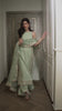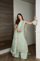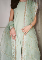 This Pastel Mint velvet ensemble exudes subtle glamour and refined femininity. The sleeveless silhouette features a graceful high neckline embellished with delicate beadwork, creating a soft, ethereal frame around the shoulders. The luxurious velvet fabric falls beautifully, offering a smooth, uninterrupted drape that highlights its rich sheen. Light hand-embellished motifs are scattered across the front, adding a touch of sparkle without overwhelming the look. The outfit is paired with an intricately embroidered organza dupatta, adorned with detailed floral patterns and shimmering accents along the borders, enhancing its sophisticated charm. Perfect for festive occasions and evening events, this design blends soft pastel elegance with timeless luxury, creating a look that is both modern and effortlessly graceful.