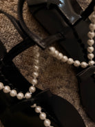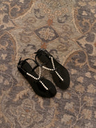 Elegant black flat sandals designed with a pearl-embellished T-strap and a delicate bow accent. Perfect for casual wear as well as festive occasions, these sandals combine comfort with sophistication.