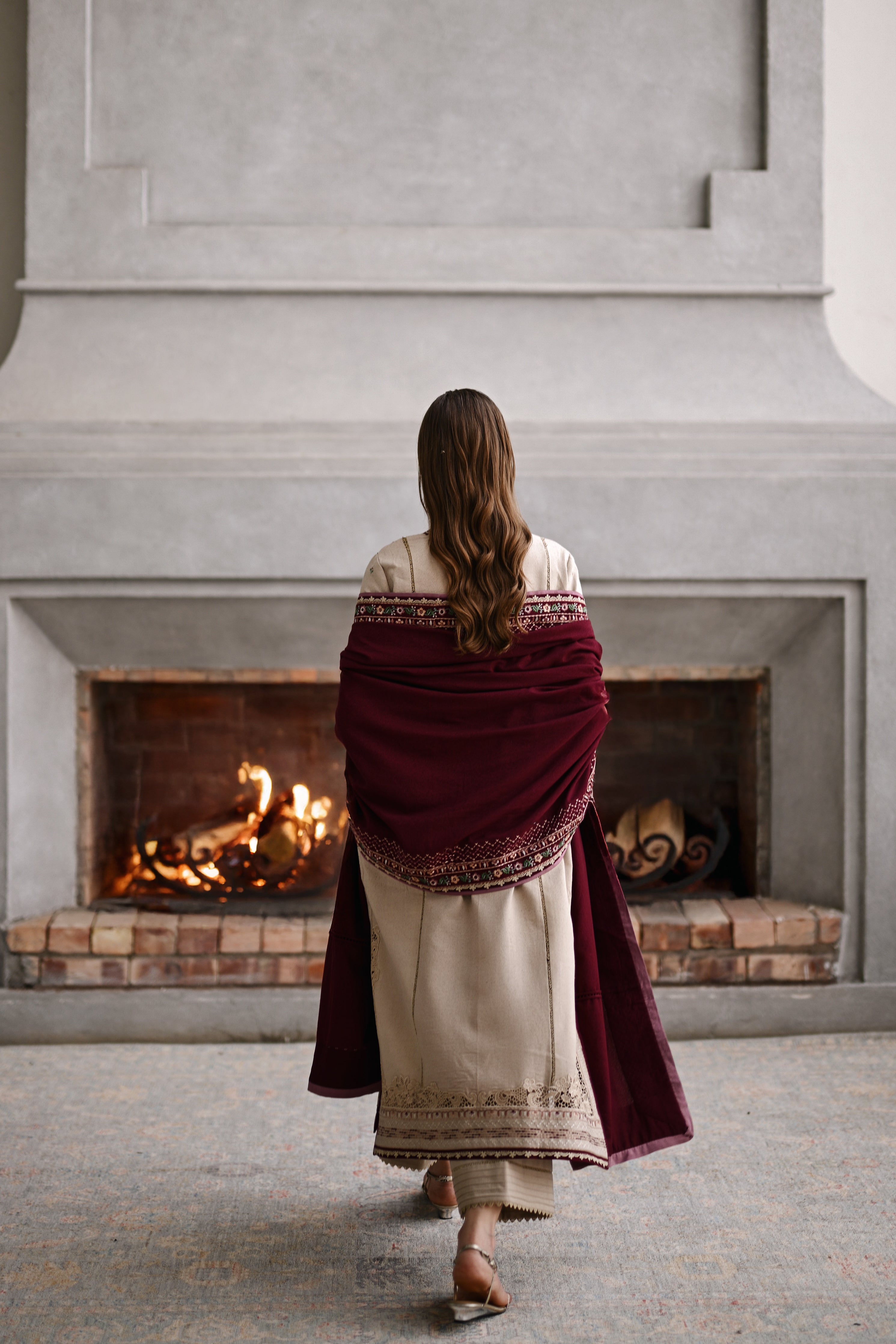 Discover understated luxury with our Beige Karandi outfit. The long shirt is detailed with a fine spray of floral embroidery, adding a touch of classic design and color to the neutral beige tone. The full-sleeved shirt is complemented by striped straight trousers and finished with a magnificent maroon shawl that features elaborate golden and maroon embroidery. This stunning shawl provides a dramatic and luxurious finish, making the outfit ideal for evening events or formal gatherings