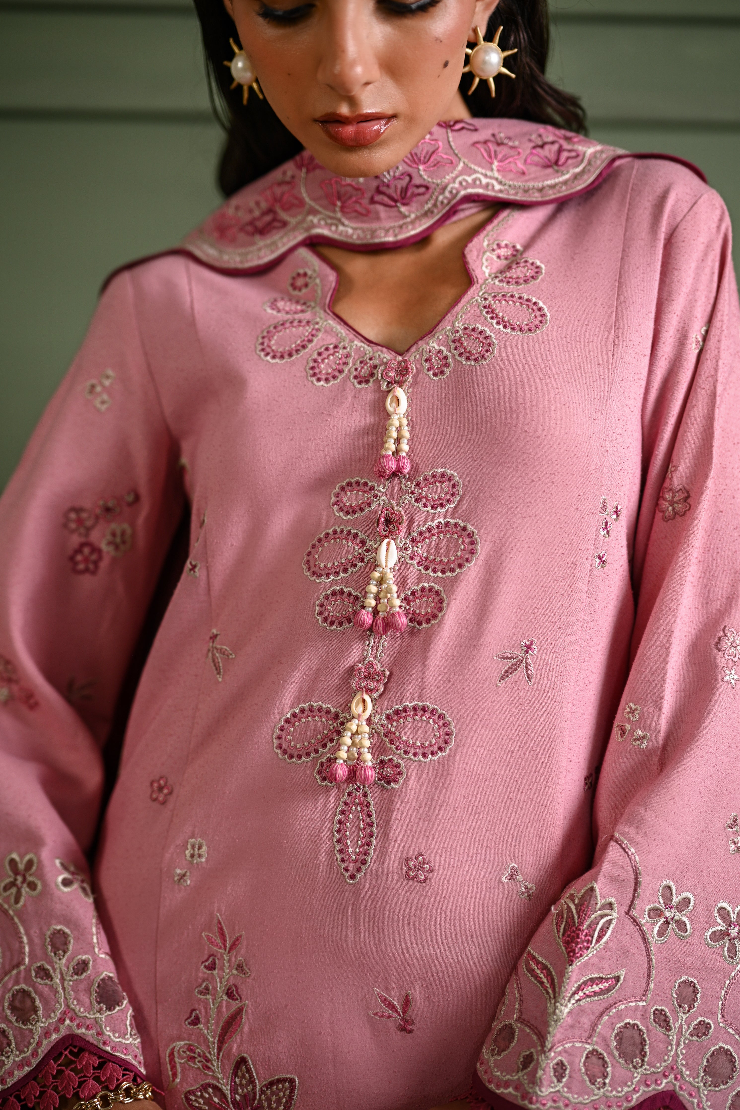 Introduce three piece karandi suit in a delicate light pink color, offering a soft and feminine aesthetic. The suit features a kameez (shirt) adorned with intricate floral and vine embroidery in a slightly darker shade of pink, creating a subtle, monochromatic effect. The shirt has a band collar and a button-down placket, while the sleeves are wide and bell-shaped, adding a modern touch. The set is completed with matching, straight-cut trousers and a coordinating dupatta that features a light embroidered pattern along the border. This elegant and understated set is perfect for semi-formal gatherings or daytime events.