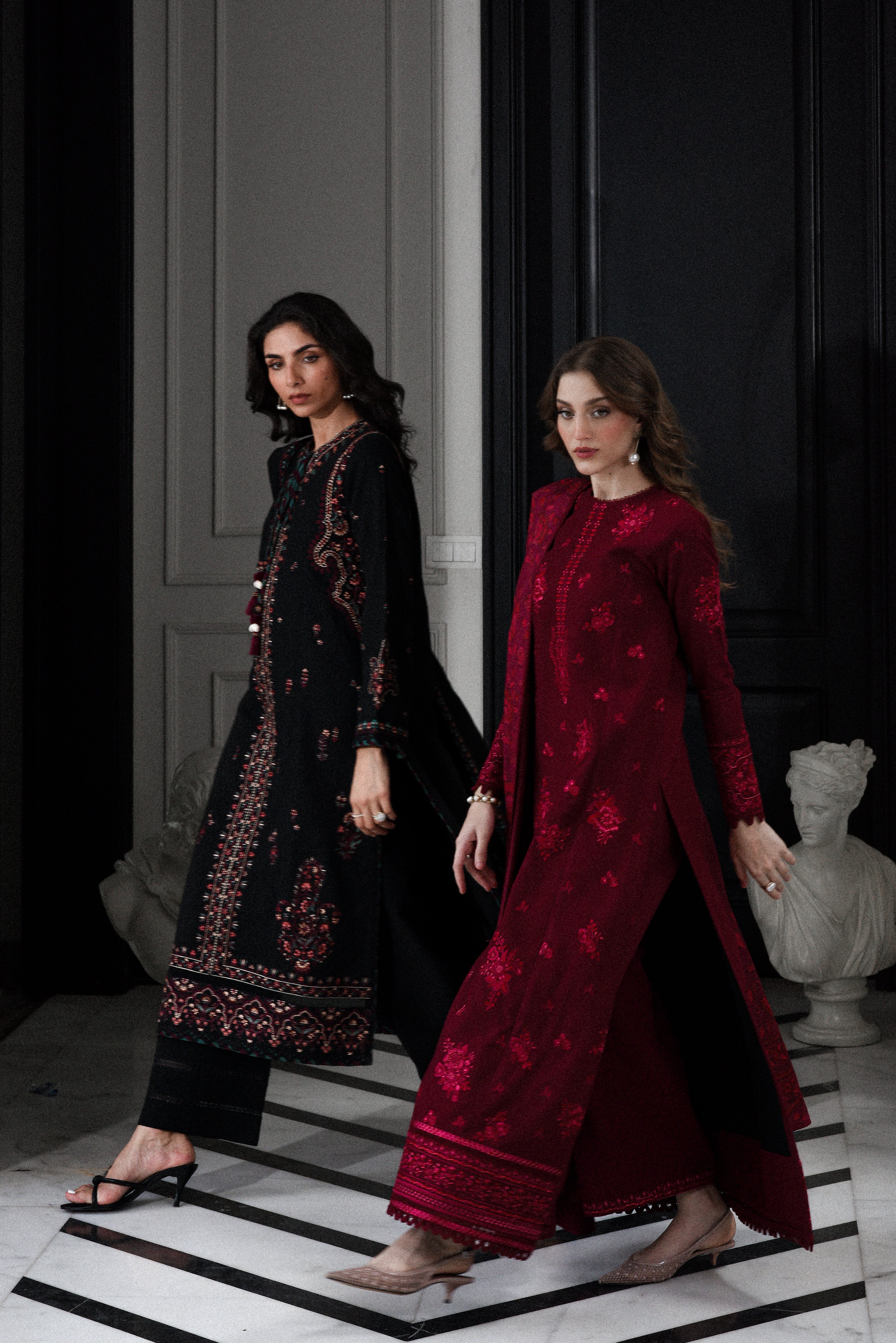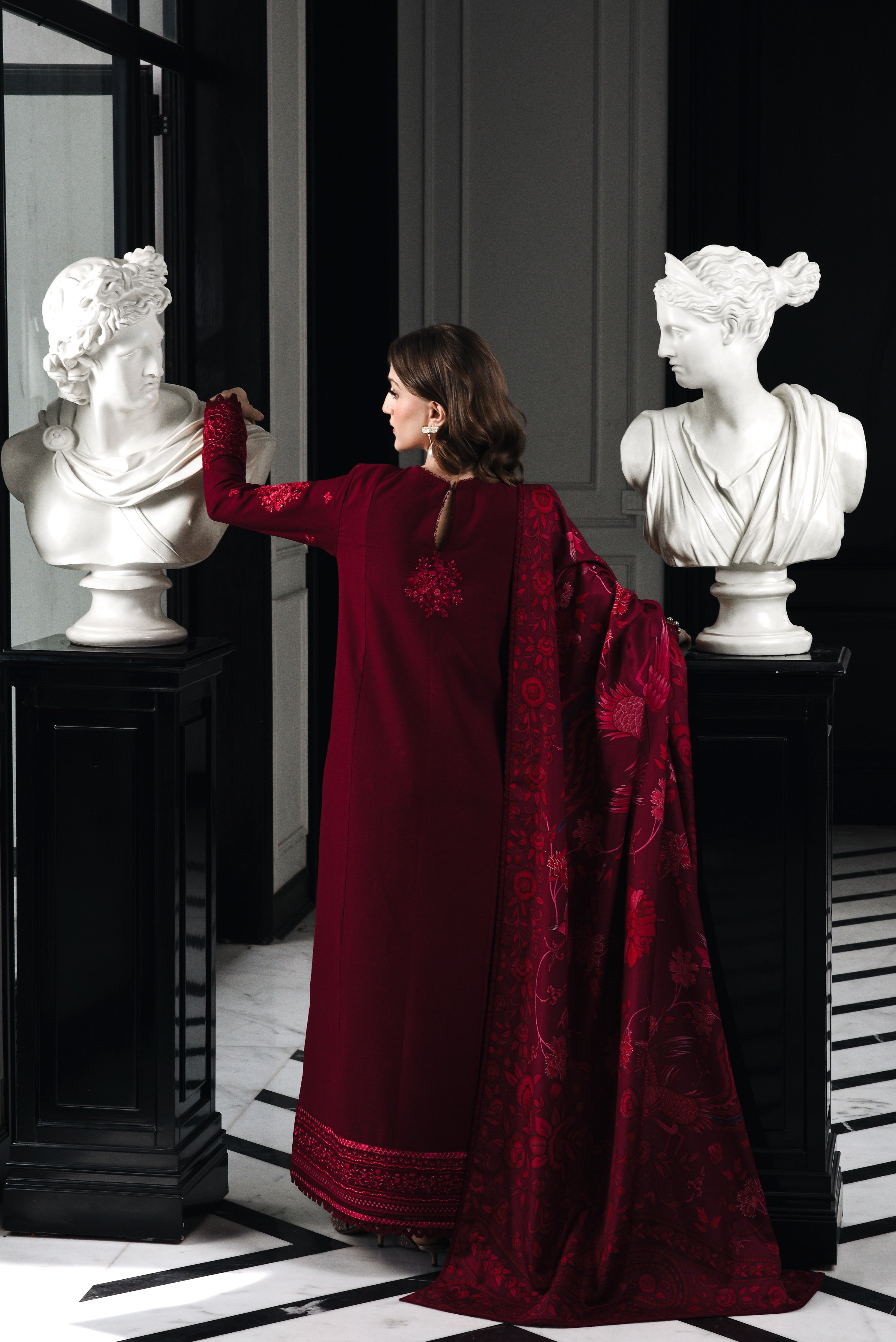 This exquisite maroon karandi three piece set is crafted with refined elegance. The embroidered karandi shirt is adorned with intricate traditional motifs, creating a rich and graceful look. It is paired with a matching karandi trouser for a classic silhouette. The ensemble is completed with an digital printed wool shawl, adding depth and sophistication. Perfect for festive occasions and winter gatherings, this outfit reflects timeless charm and luxurious craftsmanship.