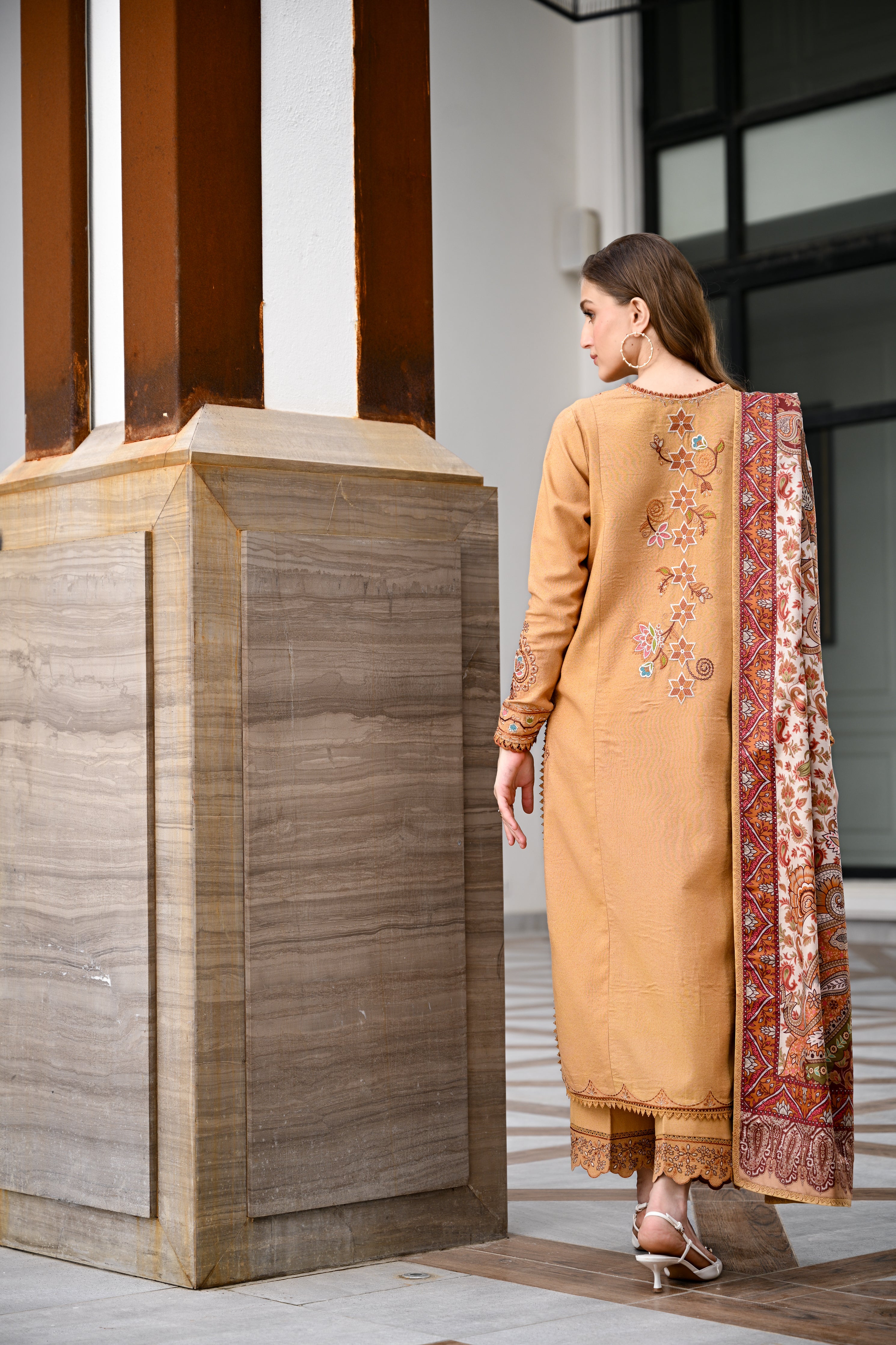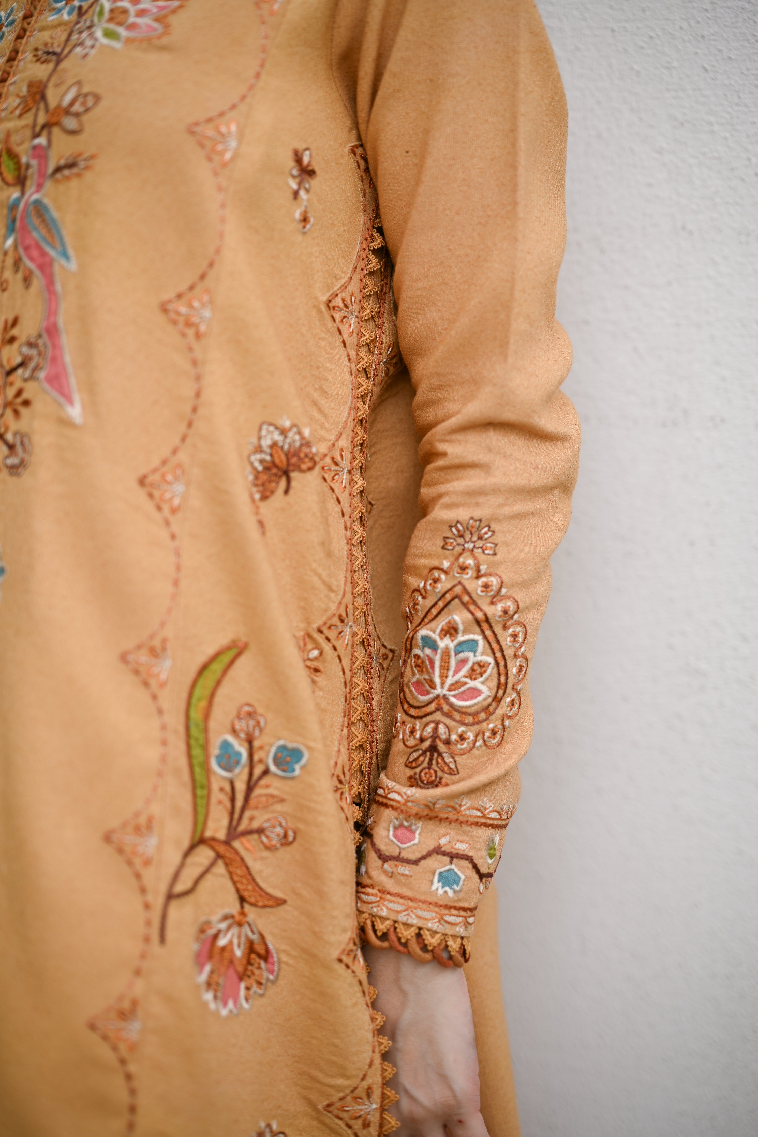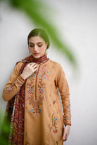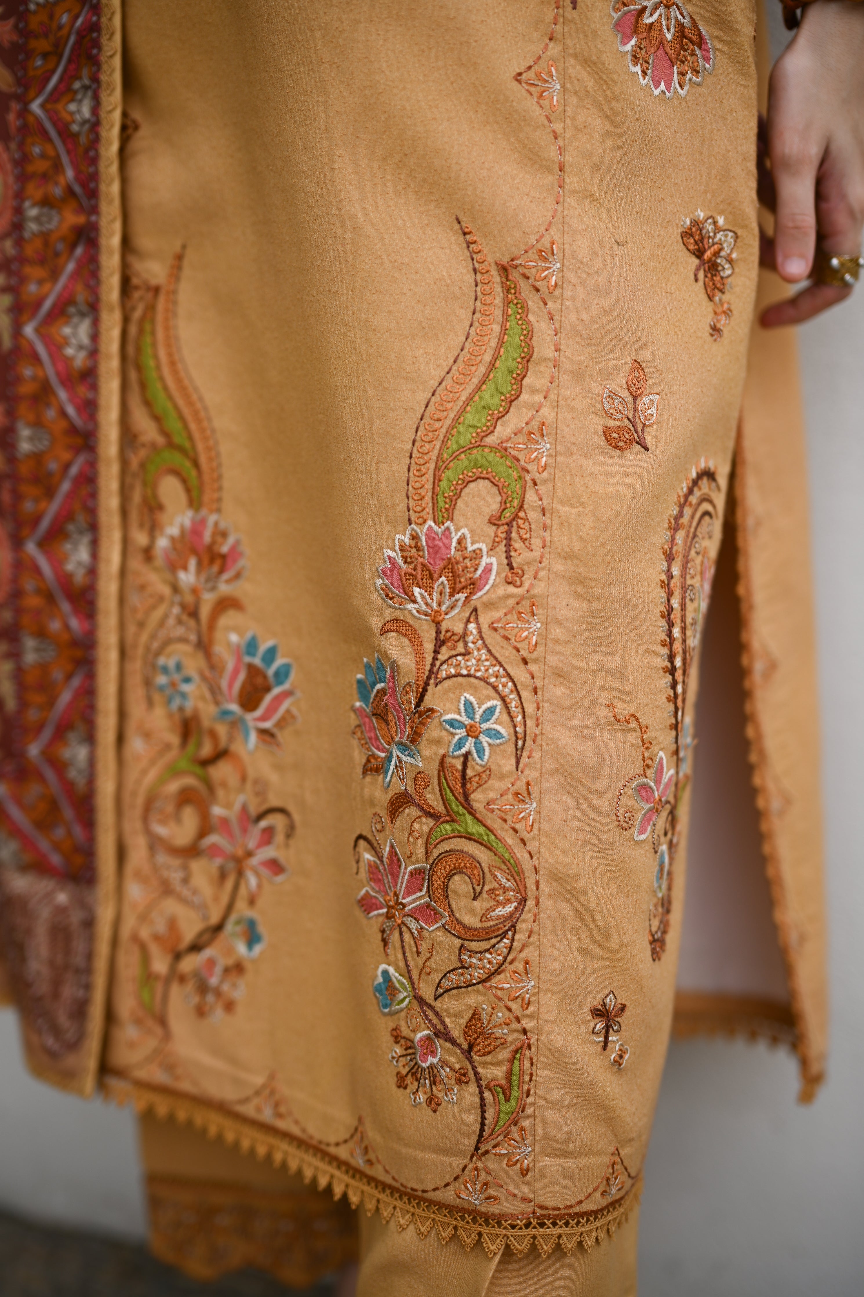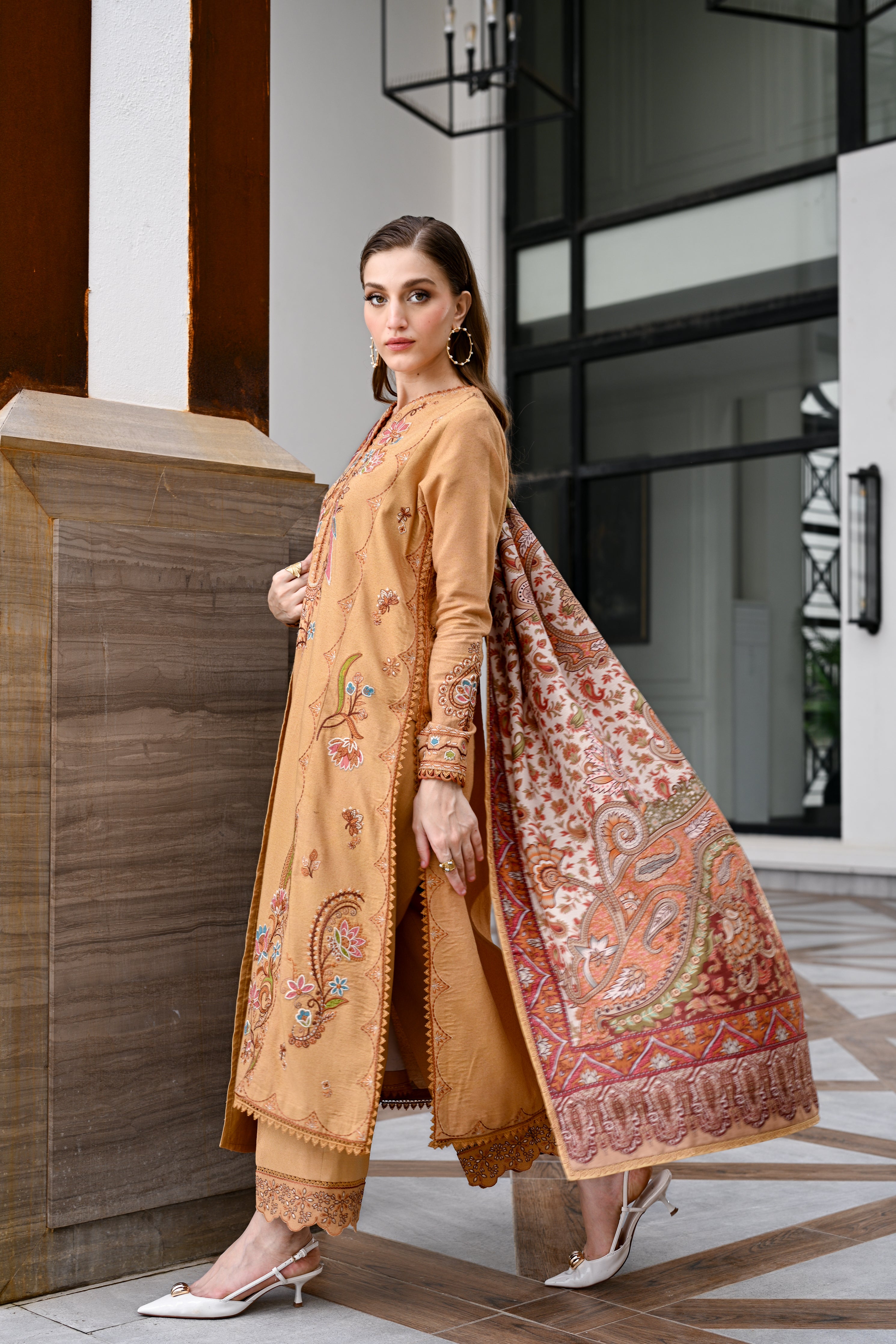 This sophisticated three-piece karandi ensemble centers on a luxurious Mustard Yellow shirt and trousers, embodying a classic warmth ideal for the cooler seasons. The kurta features subtle yet detailed ornamentation, primarily through delicate embroidery or weaving around the hemline and possibly along the borders, creating a traditional, understated elegance. The true statement piece is the coordinating shawl, which is richly adorned with a complex, elaborate Kashmiri or paisley-inspired print/weave in a vibrant palette of rust, deep maroon, terracotta, and ivory, offering a striking contrast and depth against the solid-colored suit. The overall look is one of refined, timeless tradition, perfect for showcasing cultural heritage at any elevated event.