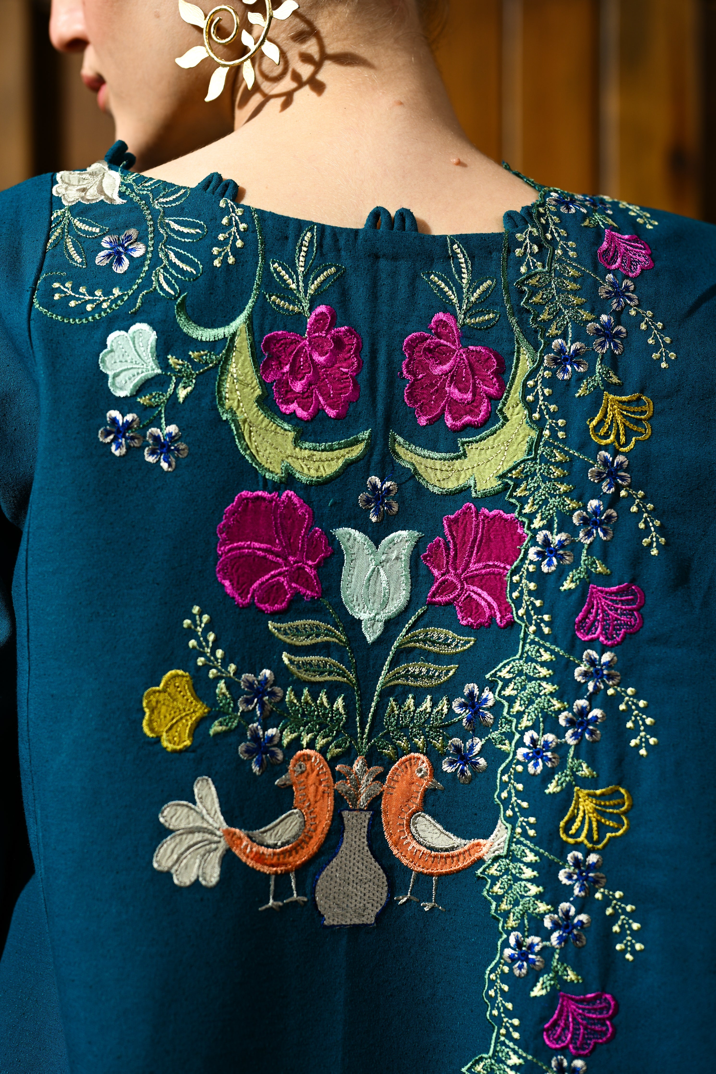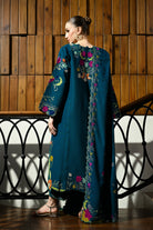 This three-piece article, crafted from luxurious Zinc Karandi, presents a stunning jewel-toned ensemble perfect for the winter season. The deep Teal/Peacock Blue base fabric is lavishly adorned with vibrant, multicolored floral embroidery that covers the front of the long shirt and extends beautifully onto the matching shawl. This intricate thread-work features shades of mustard yellow, fuchsia/deep pink, lime green, and royal blue, creating a lush, garden-like motif that is both rich and traditional. The set is completed with coordinating straight trousers, which feature subtle textured detailing or a patterned border near the cuff, ensuring a cohesive and elegantly detailed look ideal for formal occasions.