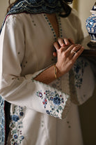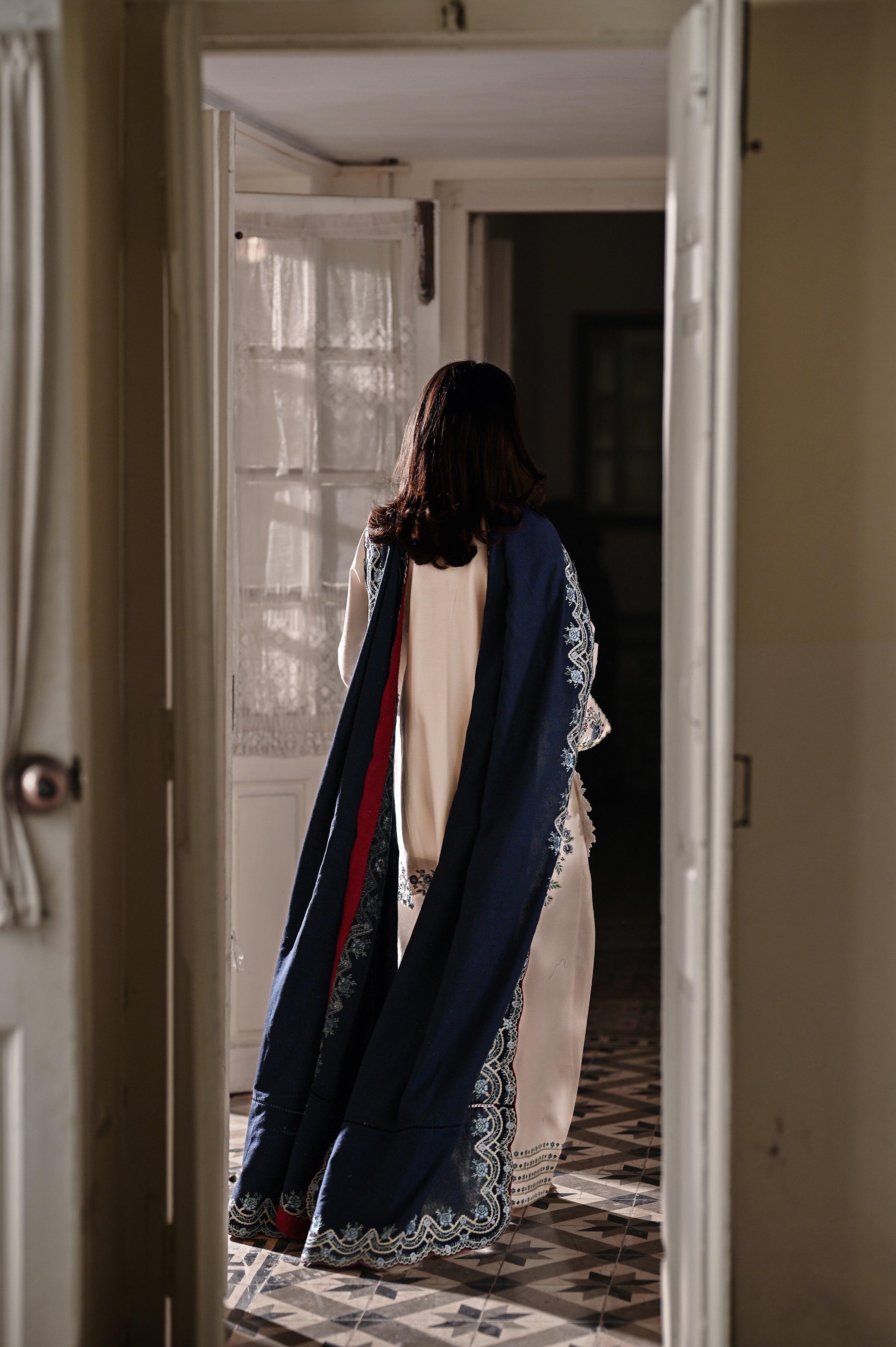 A refined white three piece karandi ensemble that radiates understated luxury. The shirt features intricate blue and lilac floral embroidery along the borders, sleeves, and hemline, enhanced with delicate lace detailing for a graceful finish. Its soft karandi fabric offers both comfort and elegance, perfect for winter wear. Paired with wide-leg embroidered trousers and a contrasting embroidered shawl, this outfit beautifully combines sophistication and tradition, making it ideal for daytime elegance or evening gatherings.