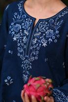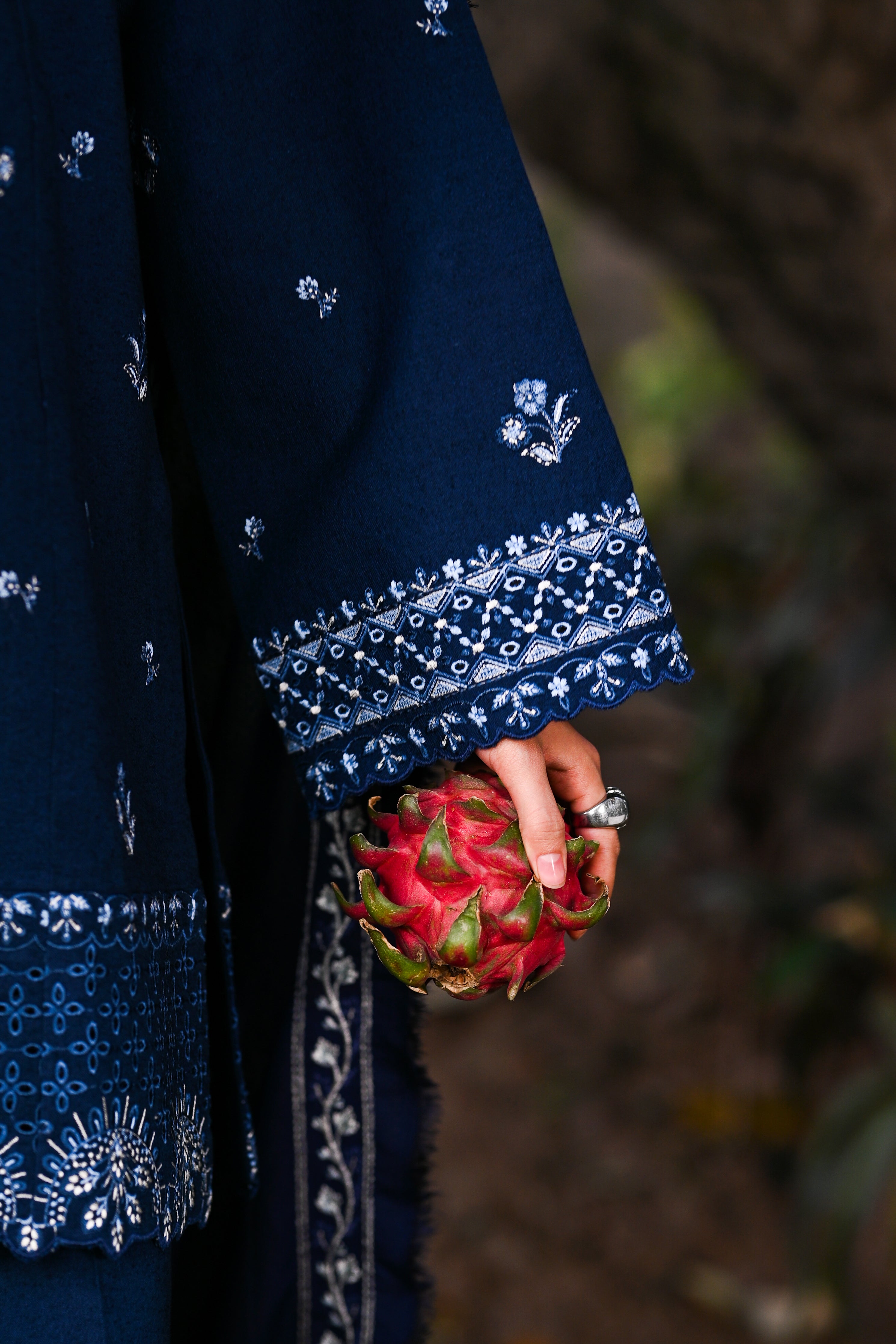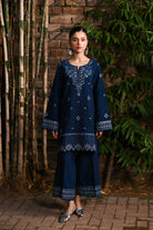 This stunning deep-blue Rice karandi 2-piece set exudes timeless elegance with its beautifully crafted embroidery and rich winter-friendly fabric. The shirt features delicate geometric and floral motifs scattered across the front, complemented by intricately embroidered borders on the neckline, sleeves, and hem for a graceful, elevated look. Its straight-cut silhouette ensures a flattering and comfortable fit. Paired with wide-leg trousers adorned with matching embroidered borders, the outfit creates a perfectly coordinated and sophisticated ensemble. Made from premium soft karandi, this set offers warmth, durability, and effortless style—ideal for casual outings, gatherings, and winter festivities.
