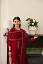This three-piece article is a beautiful and luxurious ensemble crafted from karandi fabric in a rich, deep crimson red hue, making it ideal for cooler weather and festive occasions. The long, straight-cut shirt (kameez) is the focal point, featuring intricate traditional embroidery along the hemline (daman) and the neckline/placket, using contrasting lighter reds, pinks, and white thread to create detailed floral and geometric motifs. It is paired with simple, matching straight-cut trousers, which maintain the focus on the embellished shirt. Completing the look is a large, coordinating embroidered shawl, draped elegantly over the shoulders, which also features matching delicate embroidery, particularly along the borders, unifying the entire sophisticated and classic outfit.