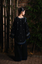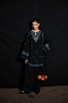 This stunning 2 piece black rice karandi ensemble exudes winter elegance with its deep base and beautifully crafted blue and turquoise embroidery. The shirt features a graceful rounded neckline with a keyhole detail, highlighted by intricate floral and ethnic-inspired threadwork that adds richness to the design. Delicately placed motifs across the front create a balanced, refined look, while the embroidered scalloped hemline and statement cuffs enhance the outfit’s sophistication. Paired with Farshi Shalwar adorned with matching embroidered borders, this set offers a perfect blend of warmth, finesse, and effortless style—ideal for evening wear, casual winter outings, or semi-formal gatherings.