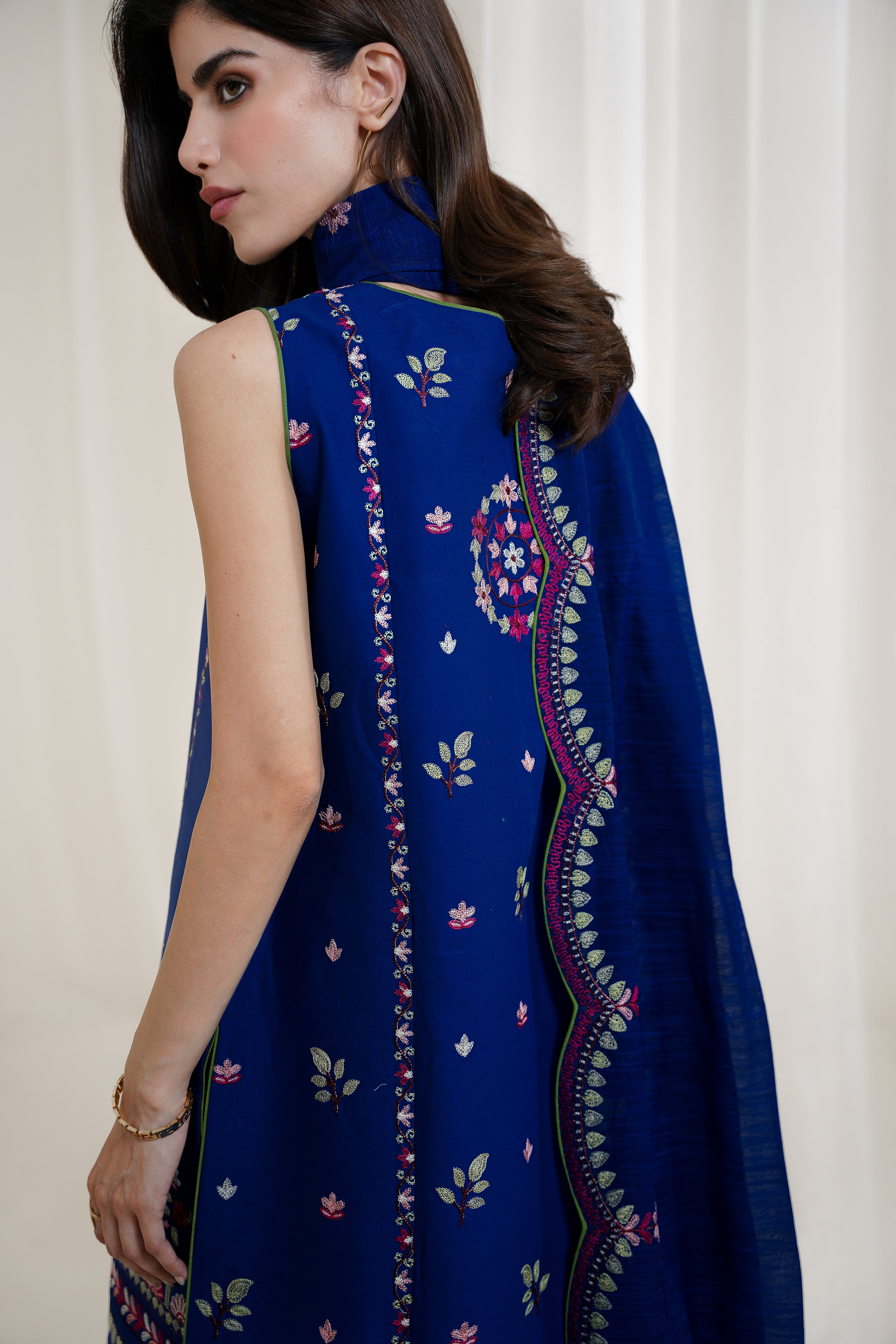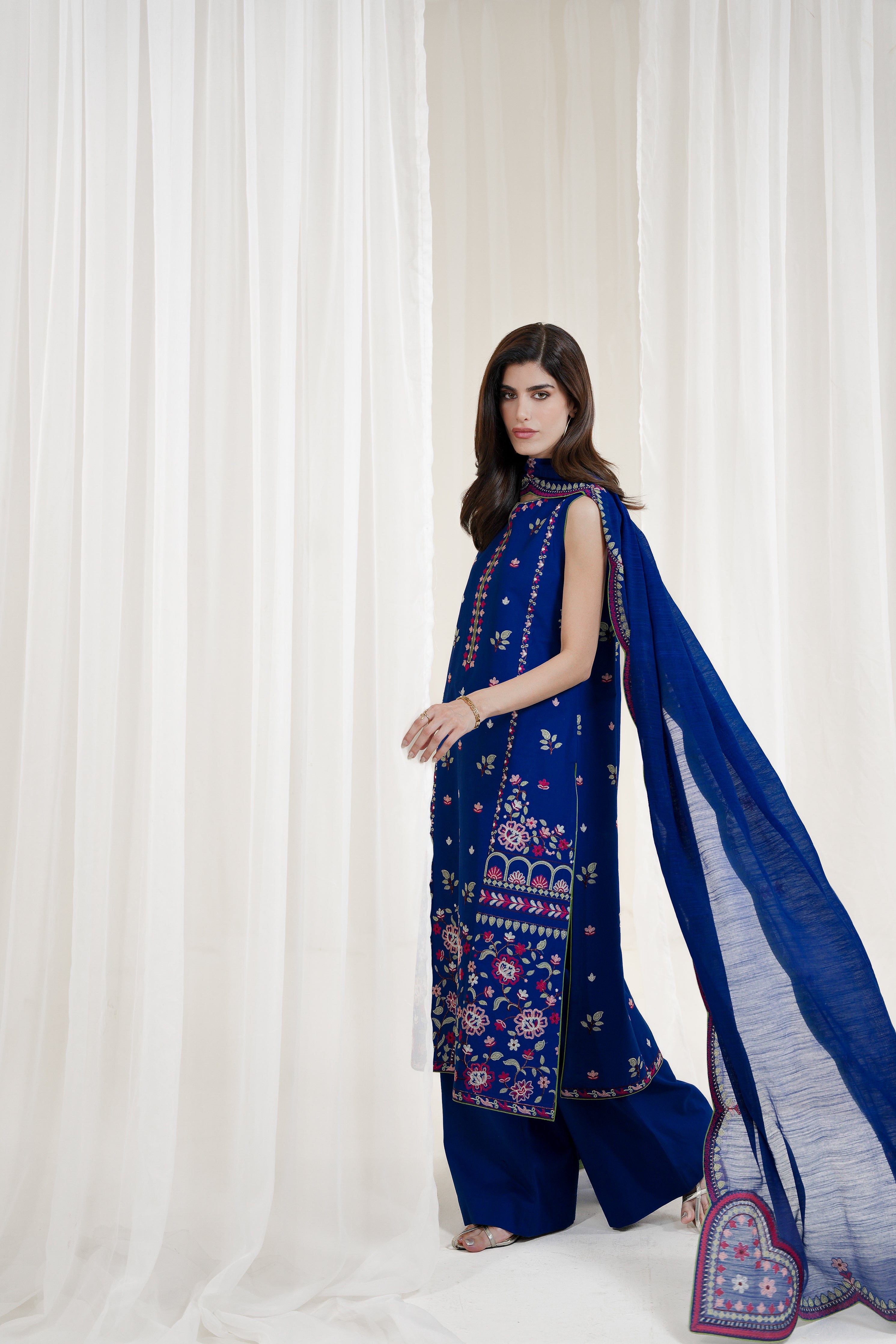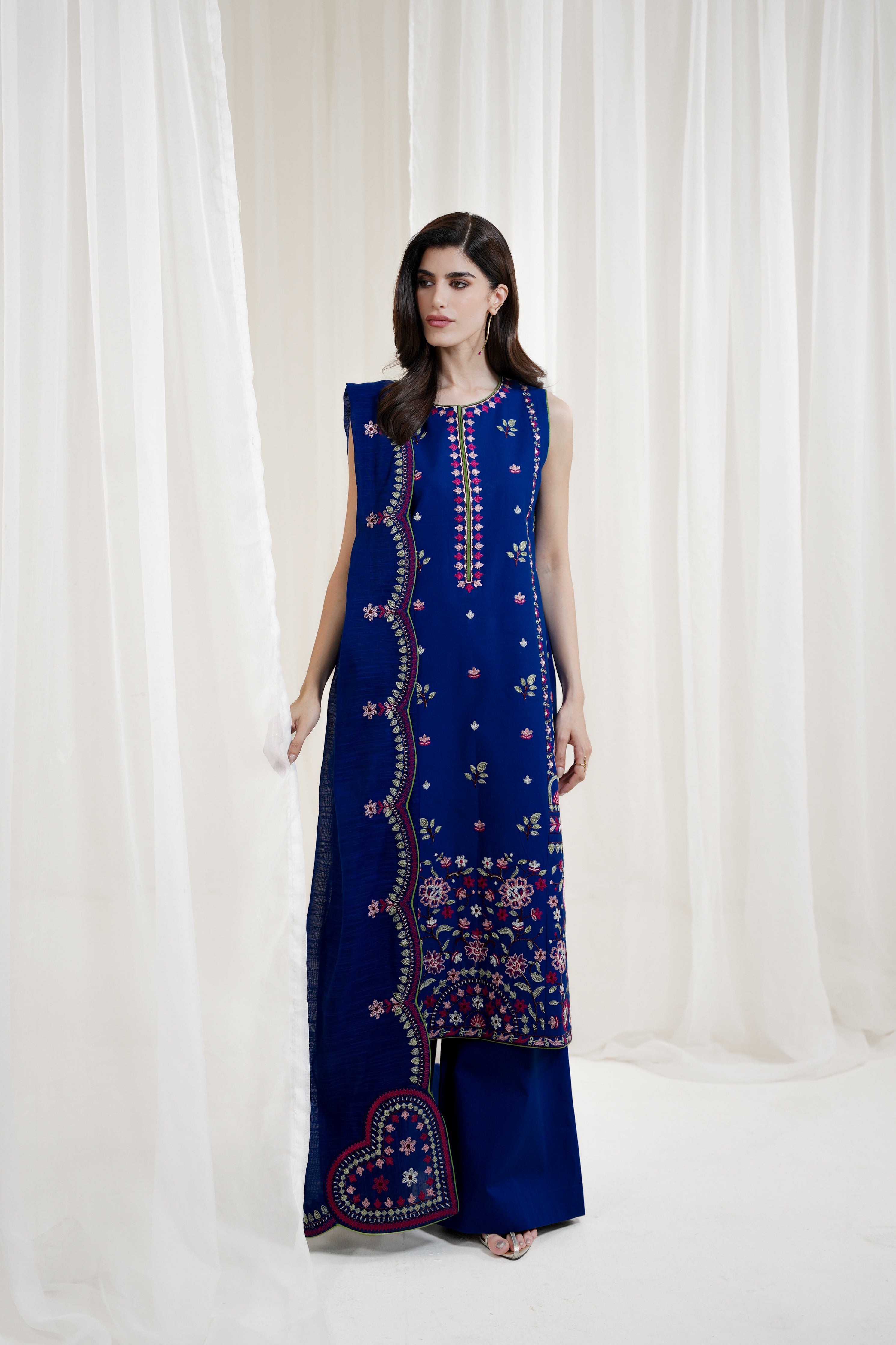 Make a bold and elegant statement with this striking royal blue three-piece ensemble. The embroidered lawn shirt features delicate craftsmanship, enhanced by a refined back spray and gracefully loose-fit embroidered sleeves. Paired with stylish culottes for a contemporary touch, the look is beautifully complemented by an embroidered slub silk dupatta that adds a luxurious finish. Sophisticated and vibrant, this ensemble is perfect for festive occasions, evening events, or formal daytime gatherings.