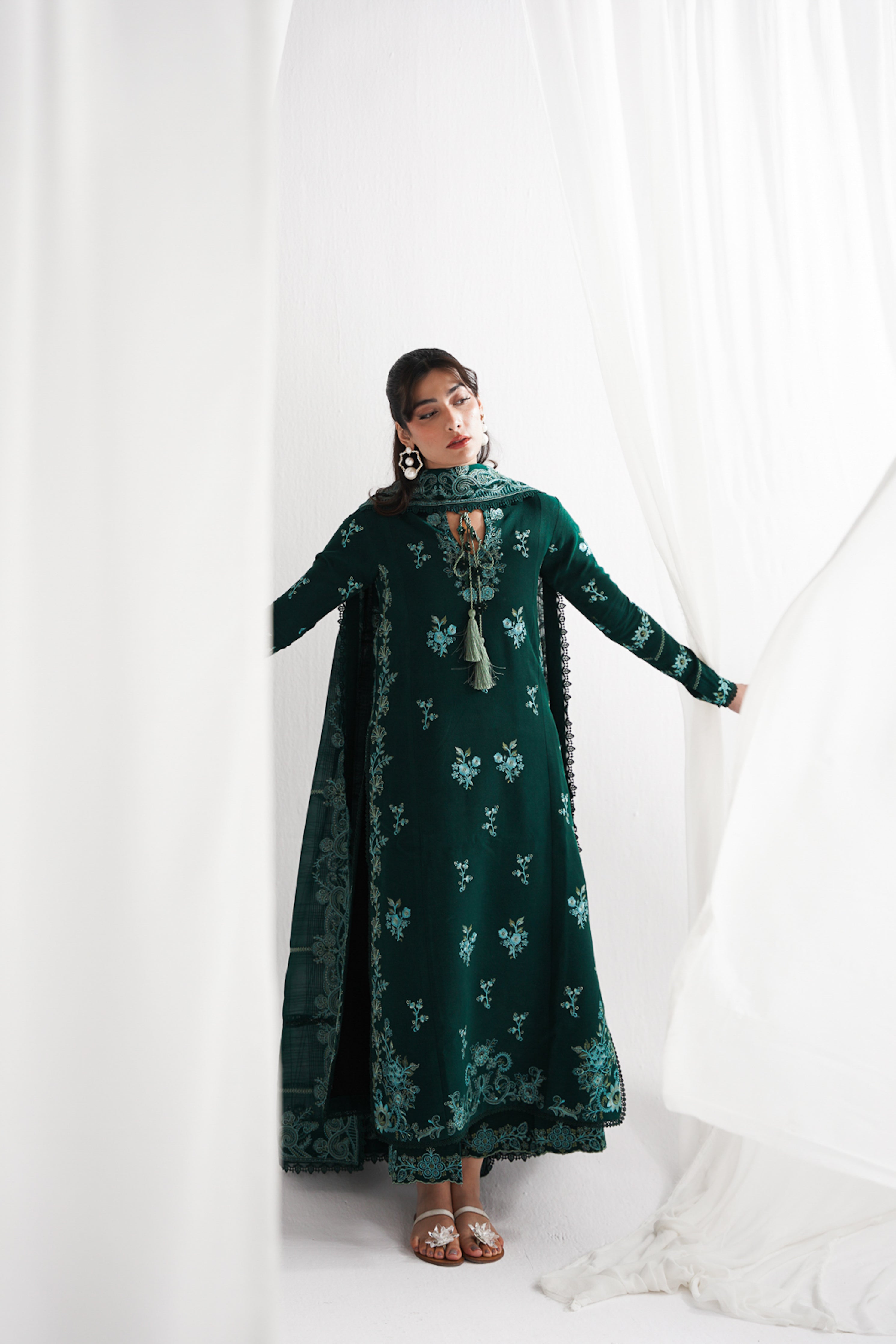 This emerald long shirt is a striking choice for celebrations, featuring delicate shifli embroidery in shades of green and blue for a vibrant and sophisticated look. The shirt is paired with a cropped izaar trouser, adorned with intricate embroidery and a scalloped cut for a unique touch. The front neckline is designed with a modern keyhole style, enhanced by handmade tassels that add an elegant flair to the dress. Completing the ensemble is a beautifully detailed embroidered dupatta, making this outfit perfect for any special occasion.