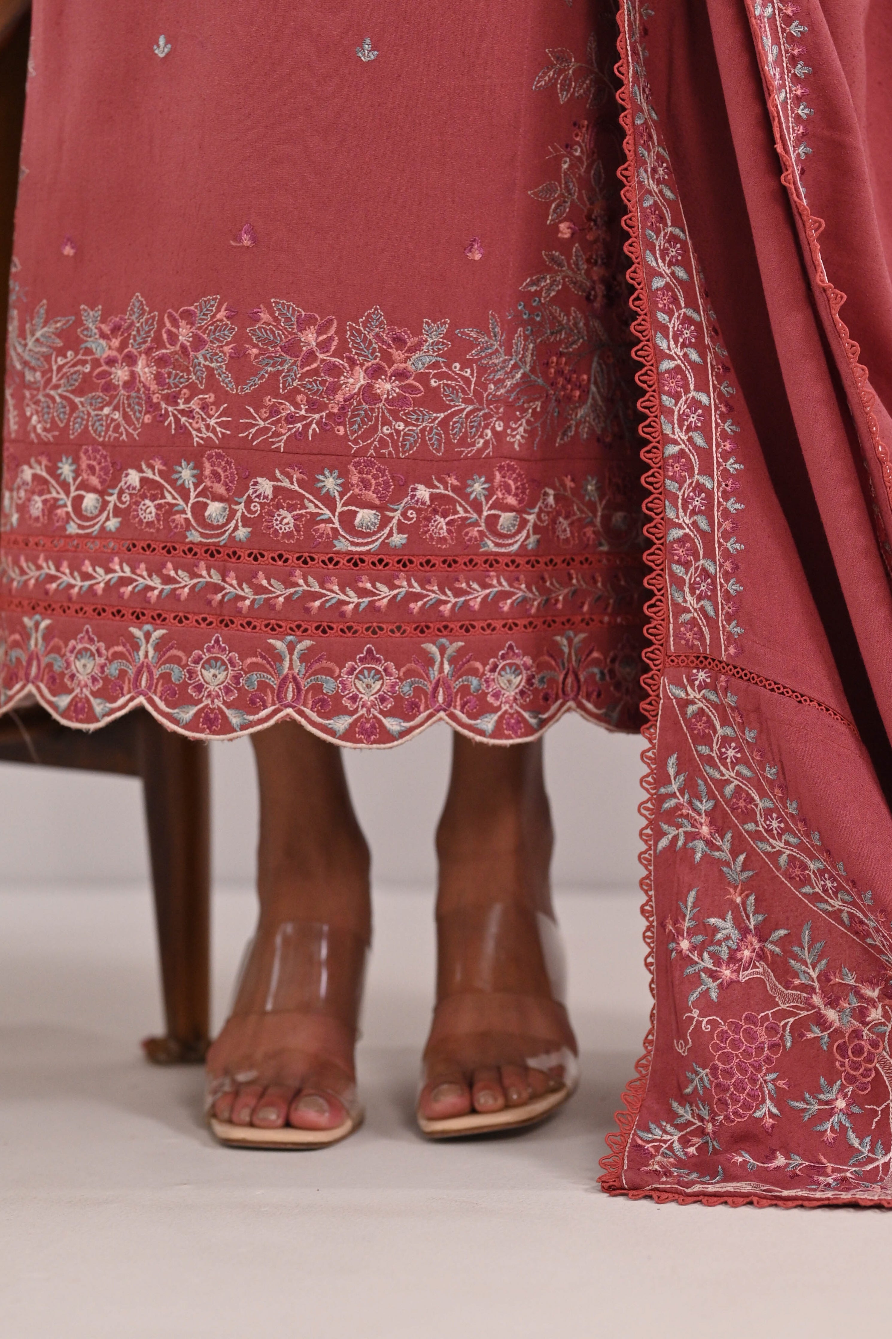 The ethereal canvas of this delicate mauve pink ensemble unfolds with meticulously crafted floral embroidery in enchanting shades of mint green, peach, and coral, forming a mesmerizing tapestry of artistry. The scalloped embroidered hem and sleeves add an extra touch of elegance. Paired with straight trousers and a beautifully embroidered border shawl.