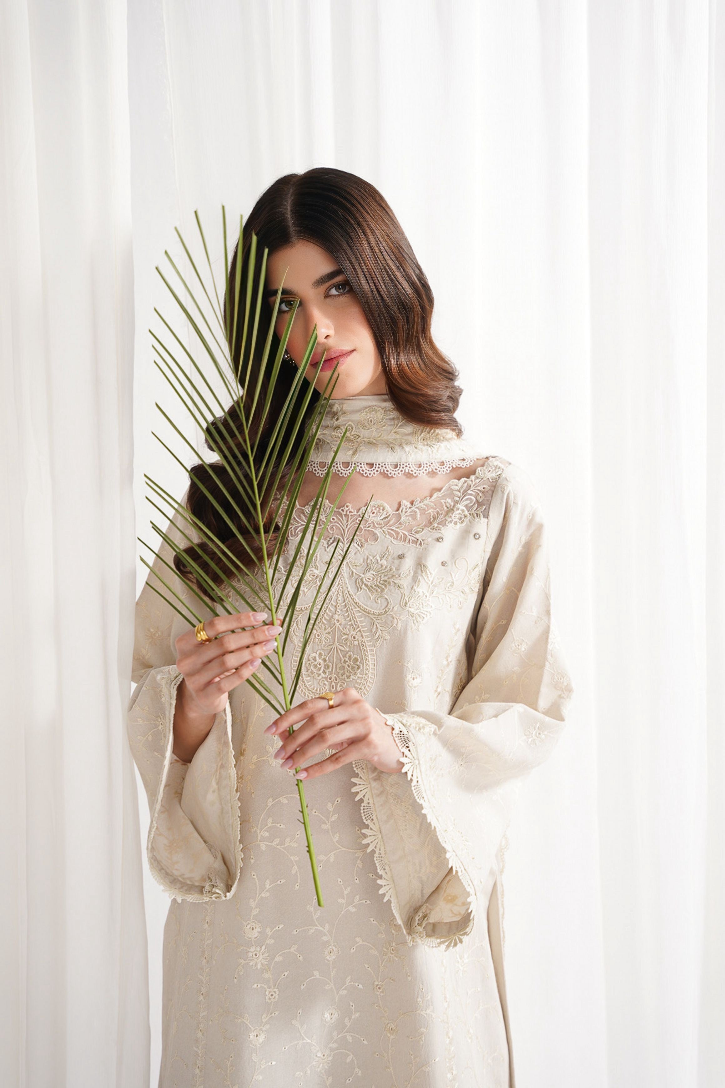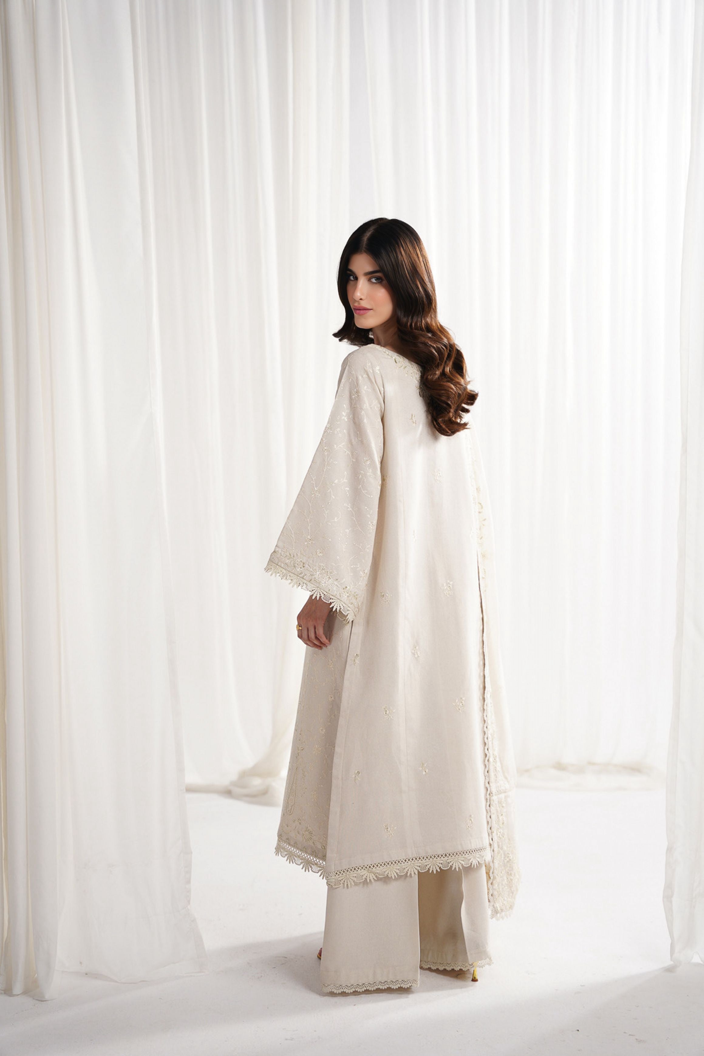 This ivory 3-piece set exudes luxury and sophistication with its exceptionally detailed design. The outfit is adorned with exquisite thread and tilla shifli embroidery, paired with a beautifully crafted cutwork boat neckline, featuring intricate handwork that elevates the entire ensemble. The wide-hem long sleeves are a standout feature, offering unmatched elegance. The look is completed with a beautifully embroidered shifli dupatta and wide-hem floor-length trouser, creating a cohesive and luxurious appearance that promises to turn heads. This modern yet timeless piece is the perfect choice for a statement occasion.