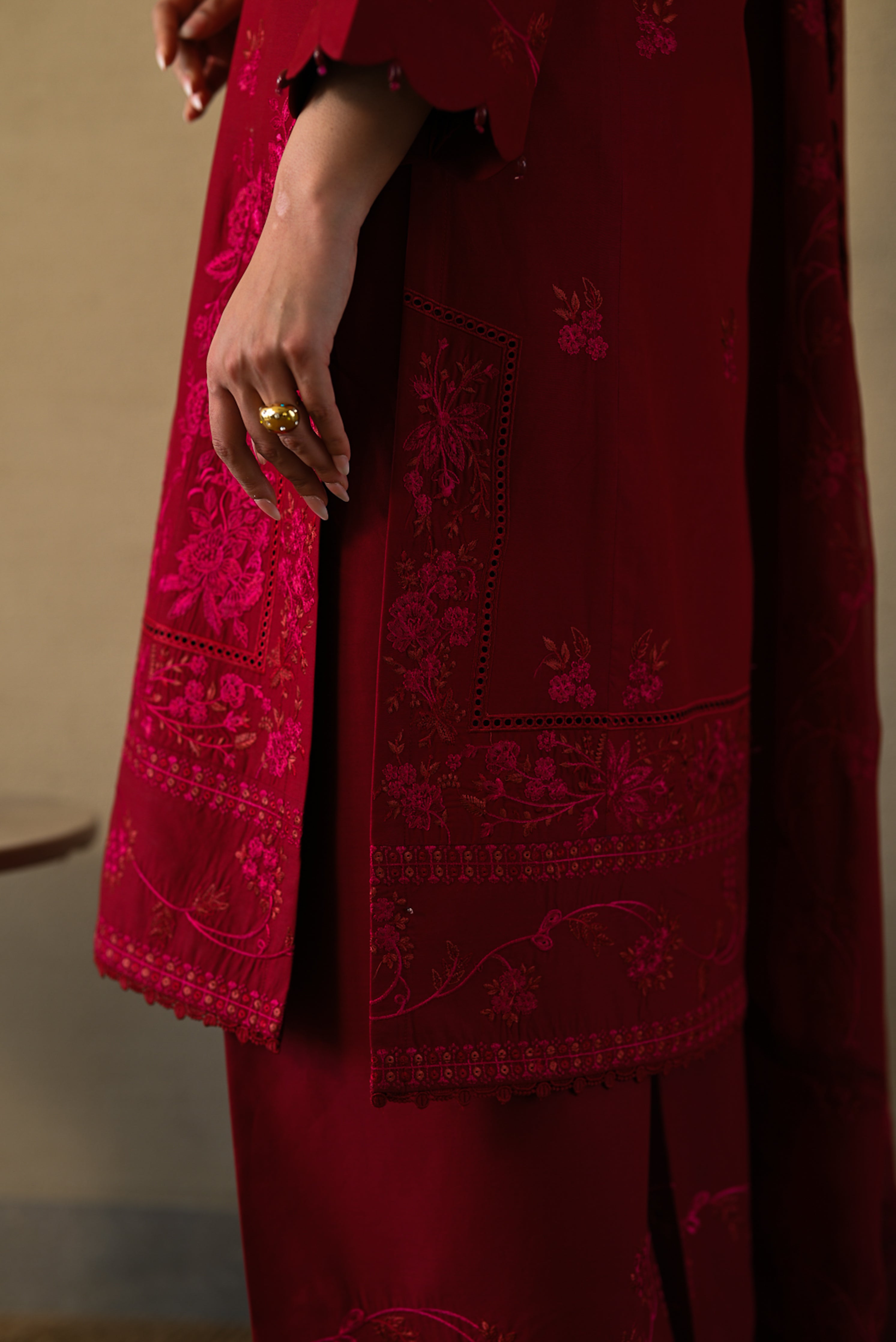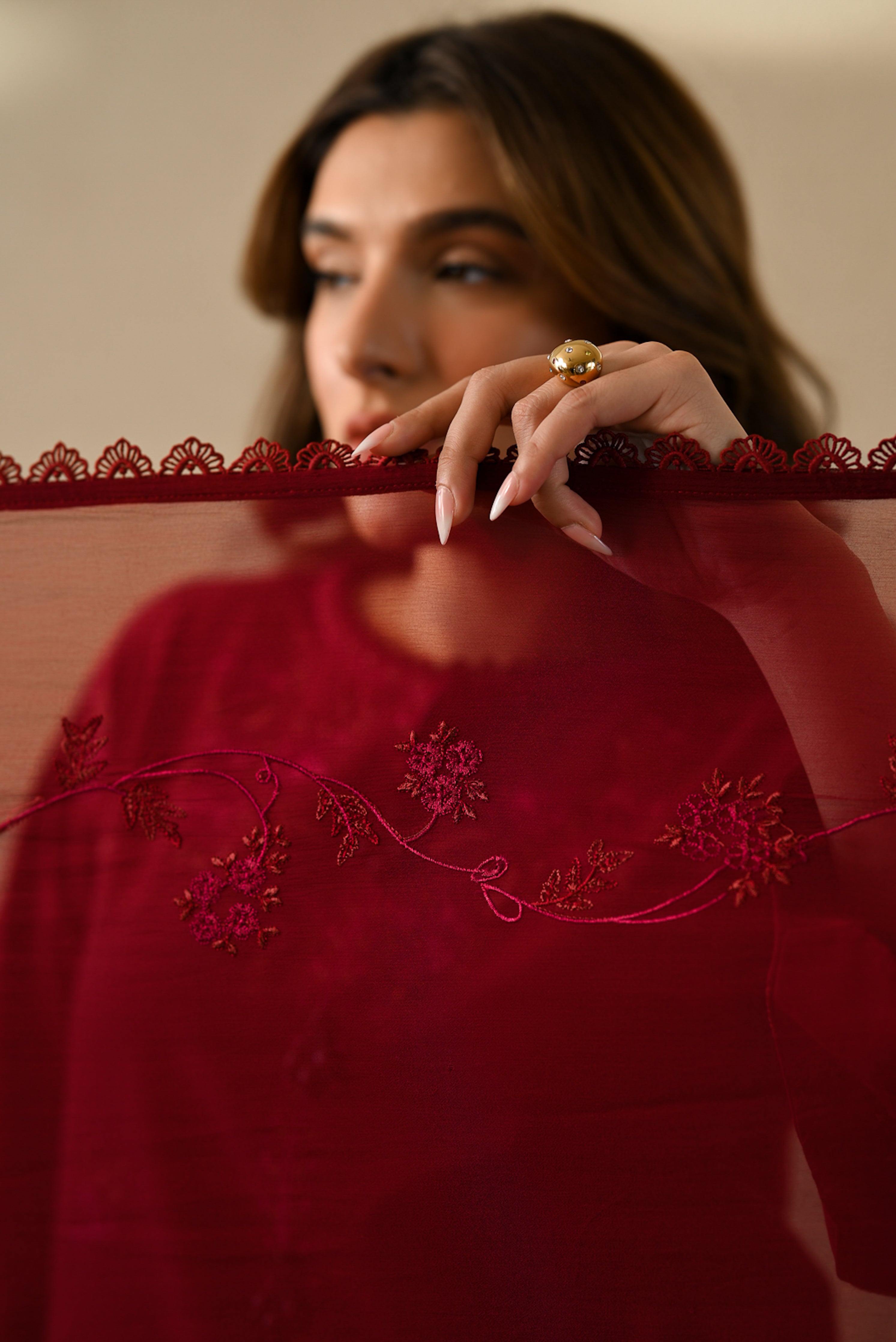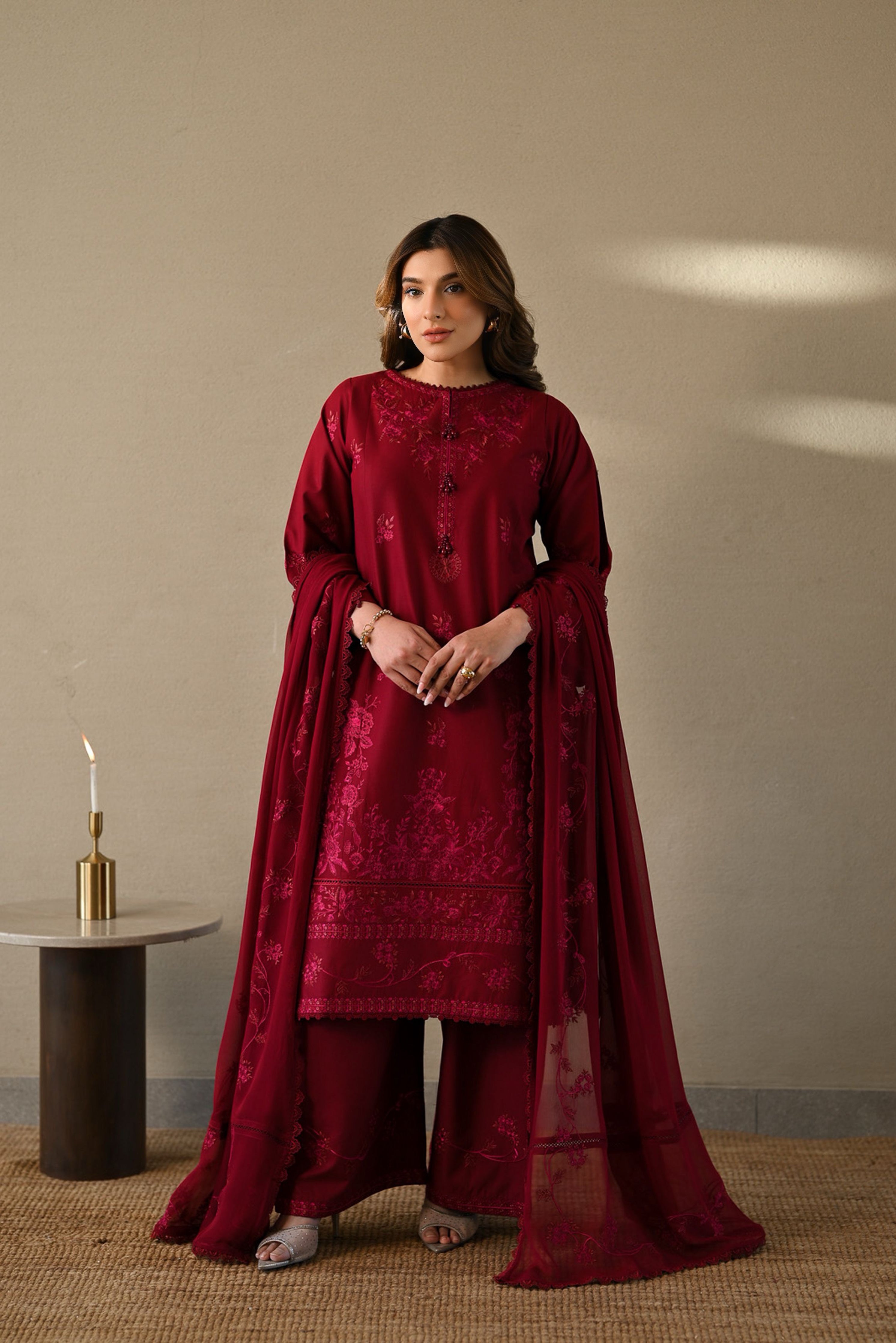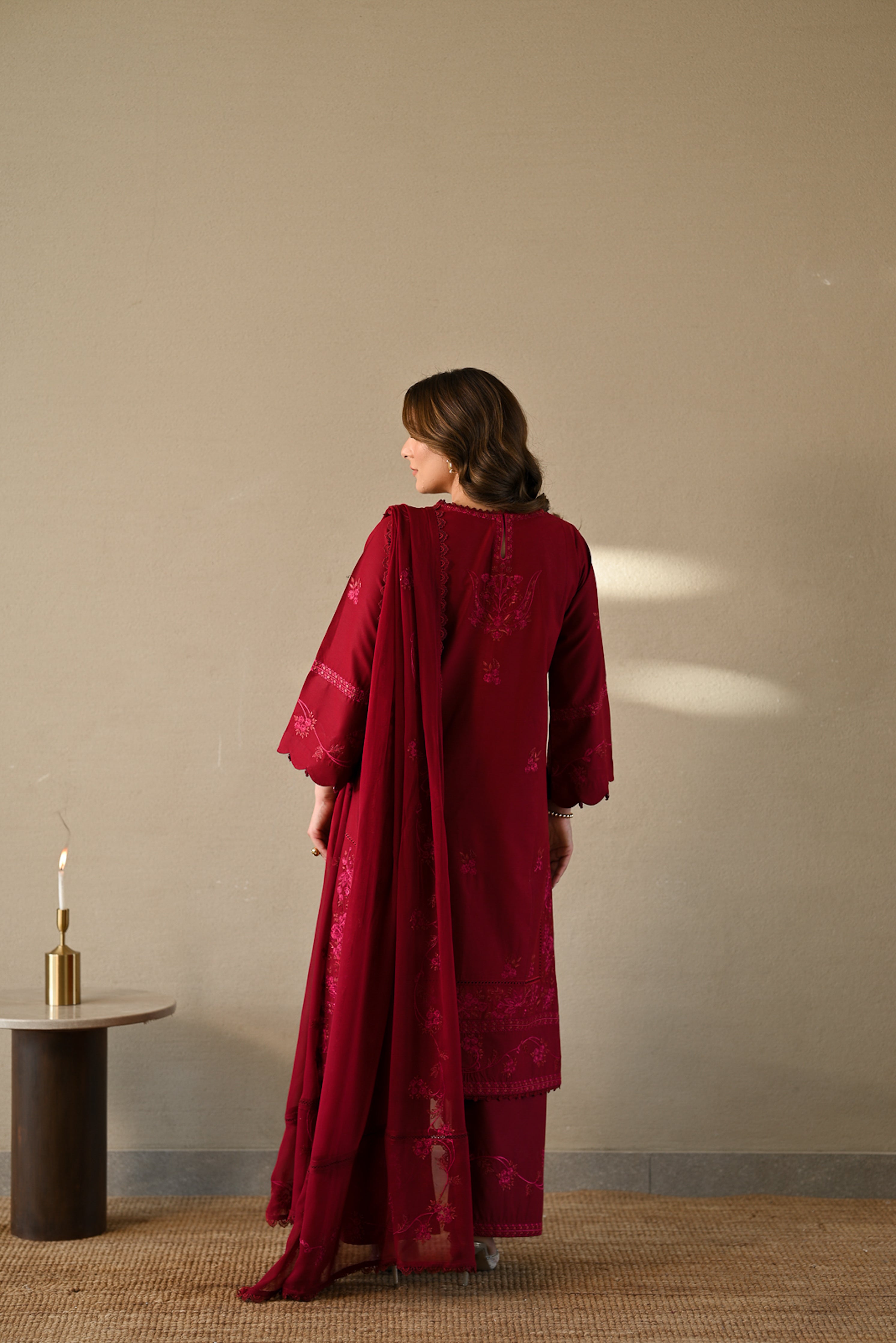 Introducing this exquisite maroon embroidered outfit, a perfect blend of elegance and tradition. The luxurious lawn shirt is intricately embroidered with delicate hanging embellishments at the neckline and scalloped embroidered sleeves. The back is adorned with beautiful embroidered motifs, adding a touch of sophistication. Paired with an embroidered trouser-shalwar, the ensemble exudes timeless charm. A matching embroidered chiffon dupatta completes the look, making it a truly regal choice.