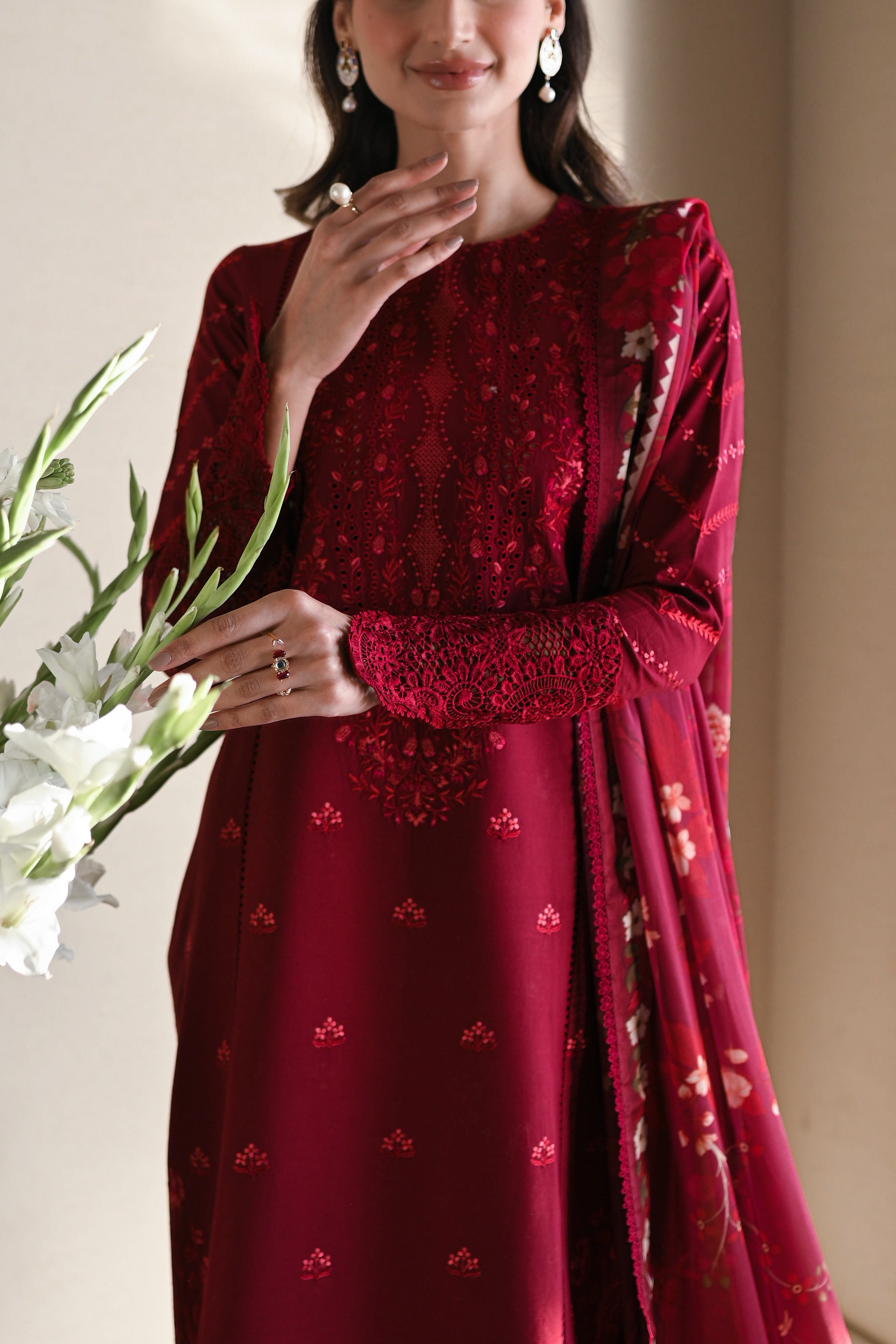 Introducing “Maroon" Draped in the opulence of Maroon, this ensemble features a stunning blend of tonal and contrasting embroideries. Intricately interwoven borders add depth and dimension, elevating the design to new heights. Delicate floral motifs grace the neckline, exuding feminine sophistication and charm. The impeccable craftsmanship ensures a flawless fusion of tradition and modernity. Paired with a luxurious printed silk dupatta, this ensemble radiates timeless elegance. The rich red hue enhances its regal appeal, making it perfect for any grand occasion. With its intricate details and refined aesthetics, Maroon is a statement of grace and style. Designed to captivate, it promises to leave a lasting impression.