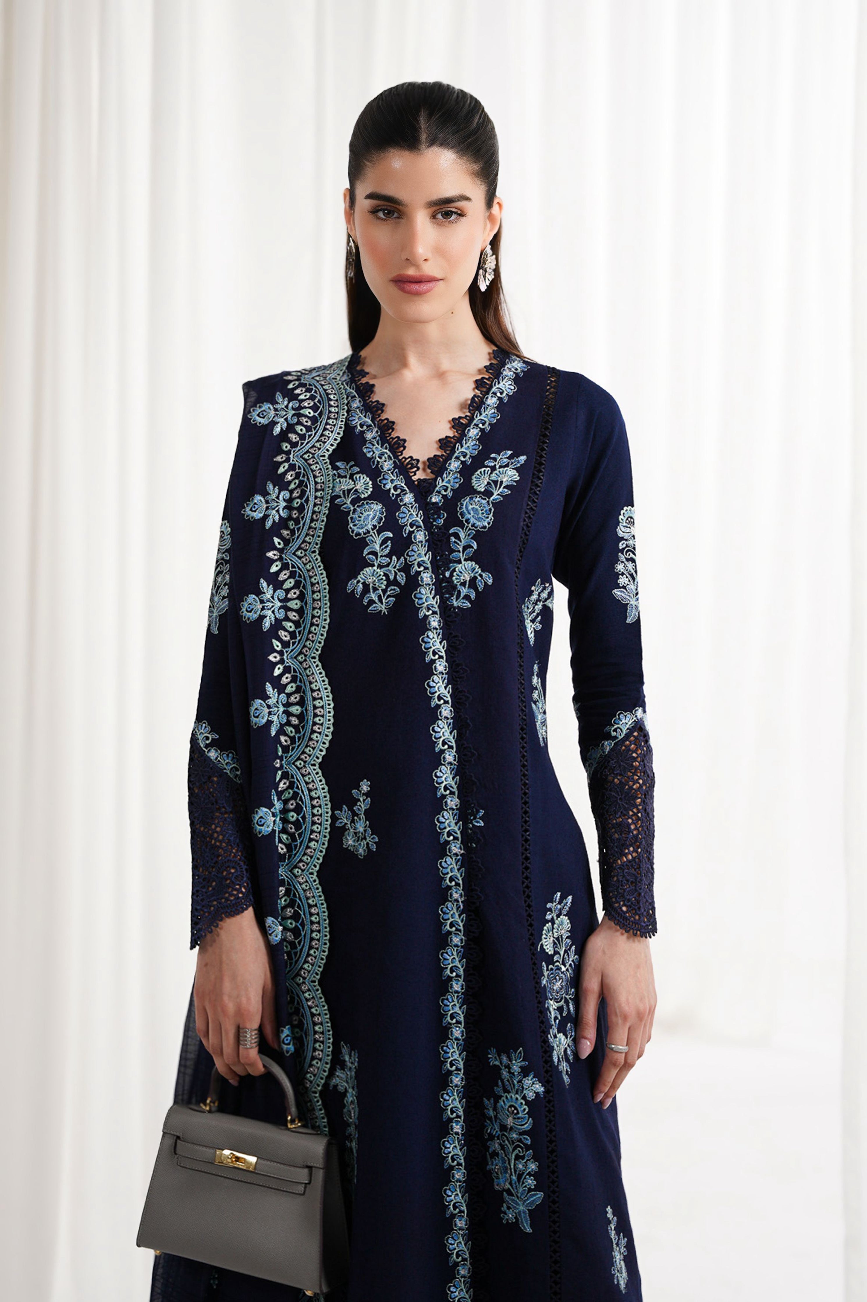 This navy blue article is a luxurious and modern paneled cut dress, featuring intricate thread and tilla embroidery that adds a touch of sophistication. The sleeves are adorned with delicate dissolving embroidery at the hem, creating a graceful, refined effect. The ensemble is complemented by a scalloped dupatta, which enhances the overall elegance, and paired with a modern short-length trouser for a chic, contemporary look. This stunning outfit effortlessly blends traditional craftsmanship with a stylish, modern silhouette.
