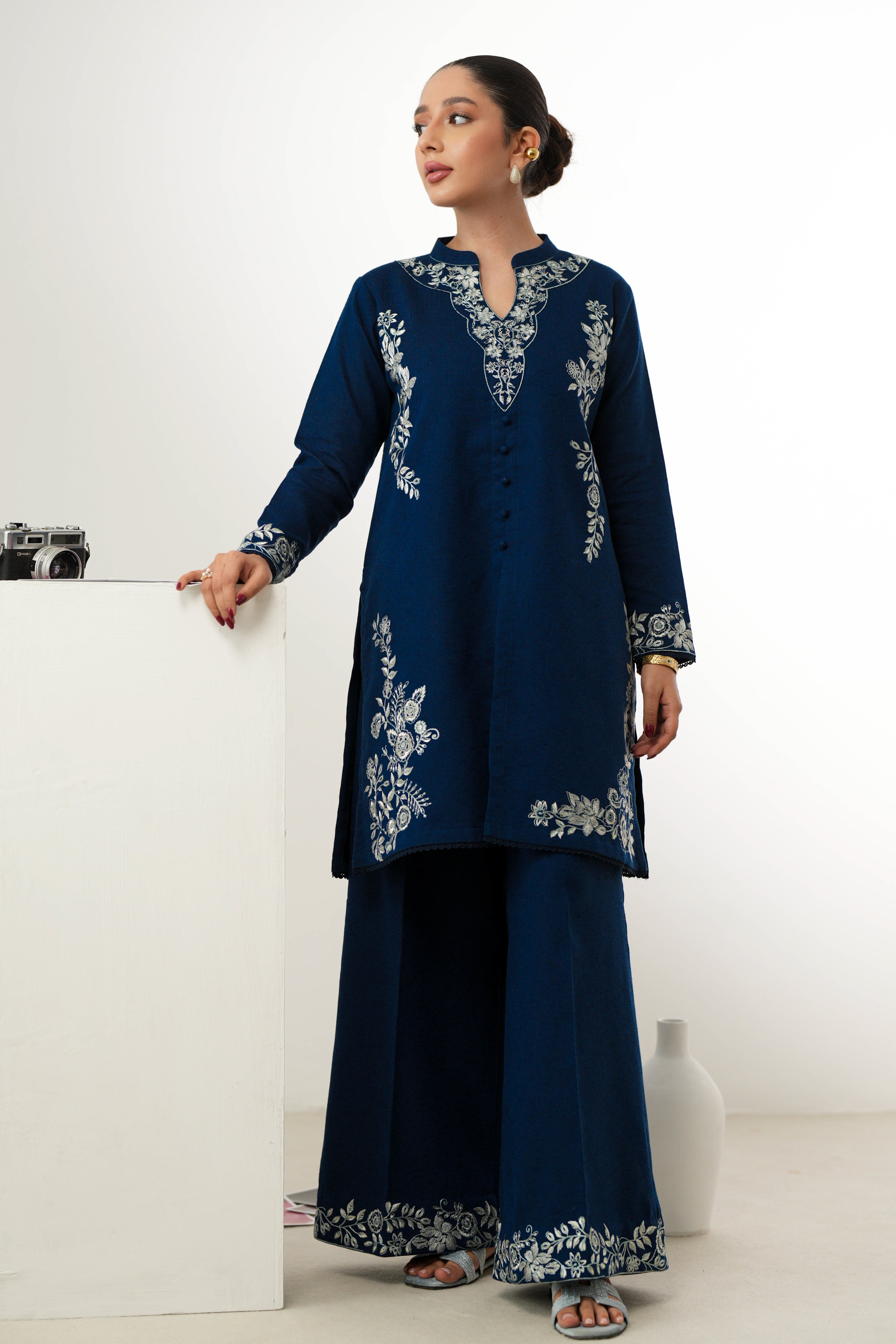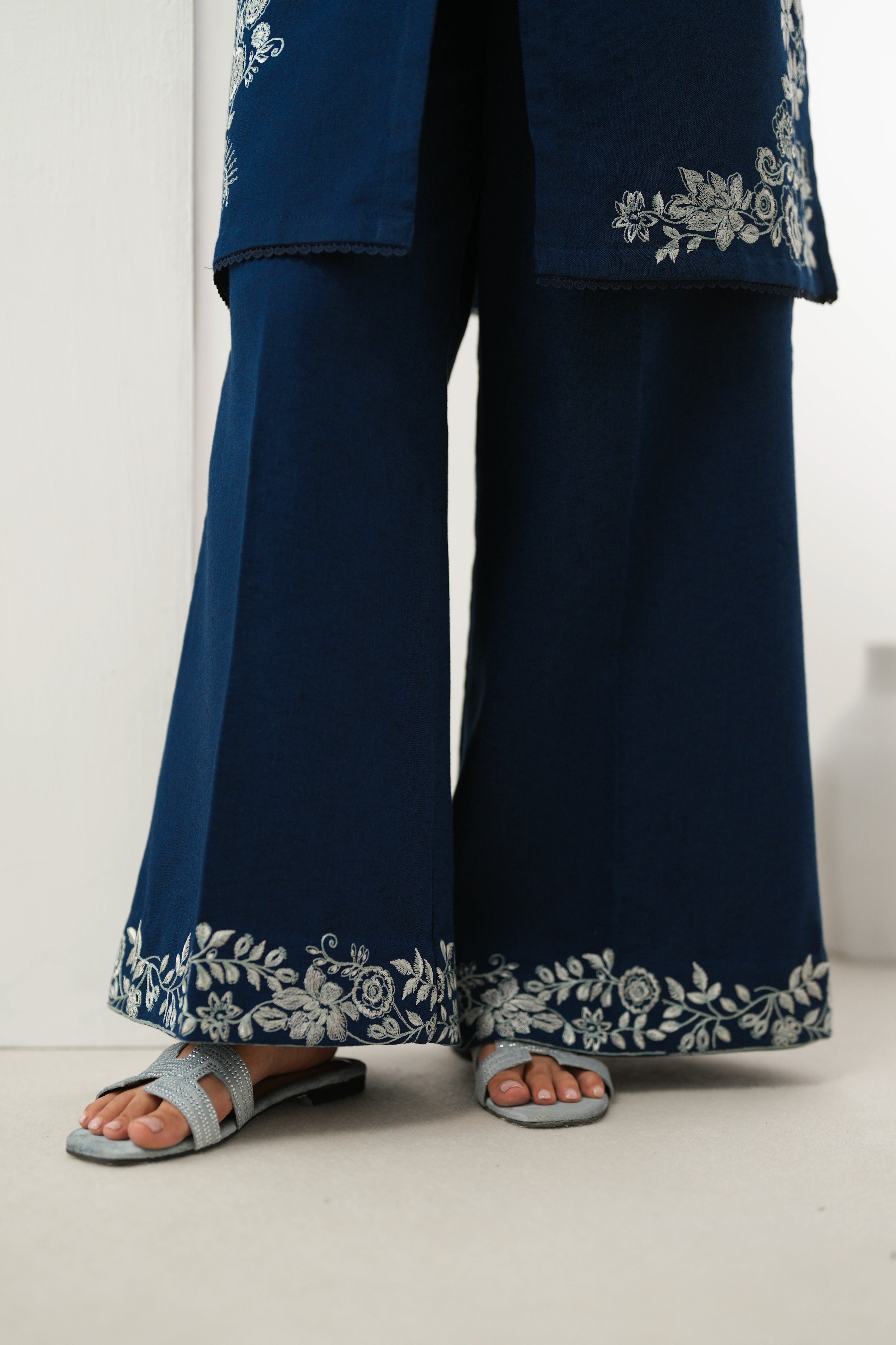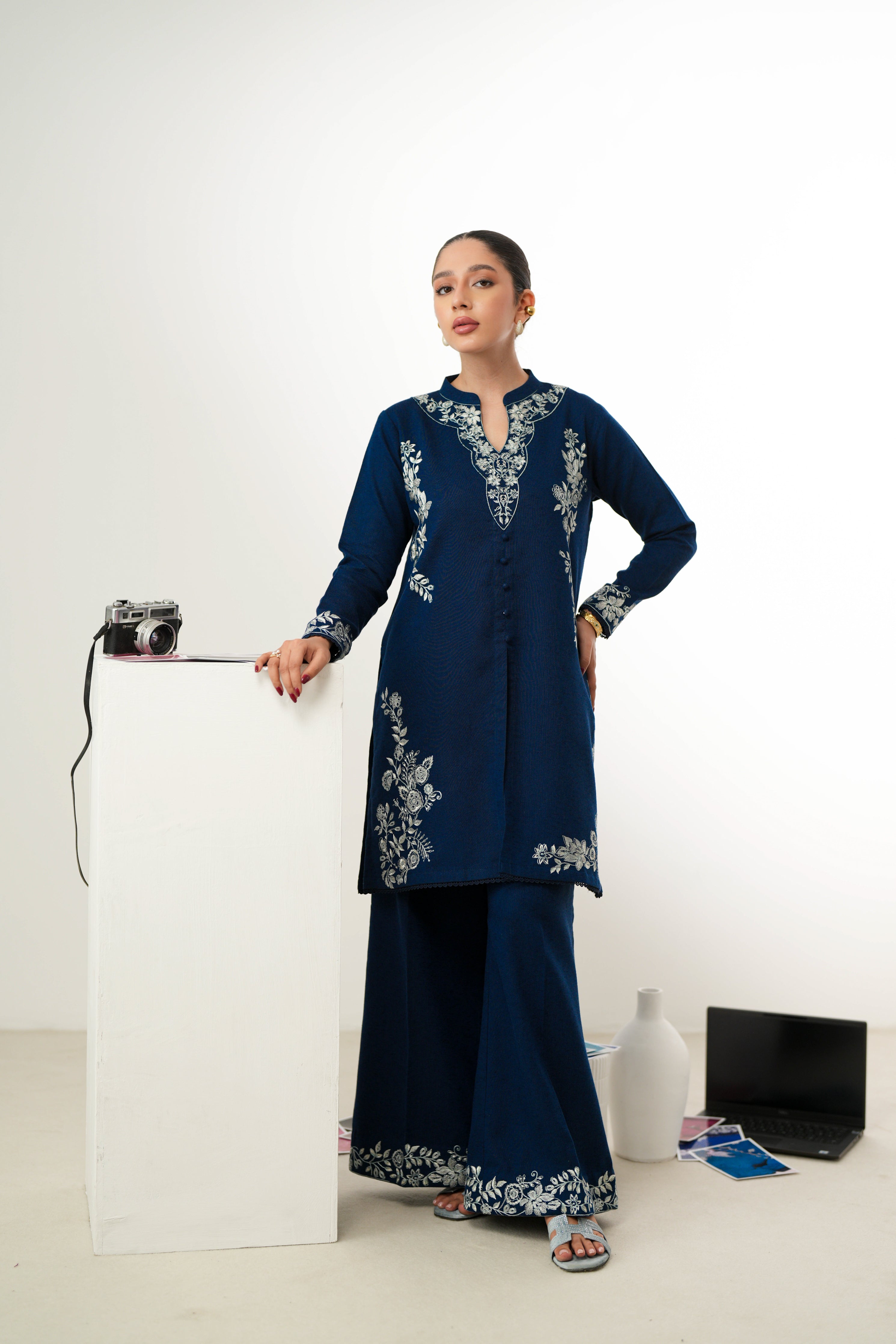 This elegant navy-blue ensemble features an open shirt design with tapered sleeves and a classic ban collar, exuding timeless sophistication. Delicate embroidery adorns the neckline, shirt front, sleeves, and trousers, adding intricate detail to the look. Paired with trendy bell-bottom pants, this outfit seamlessly blends traditional craftsmanship with modern flair.