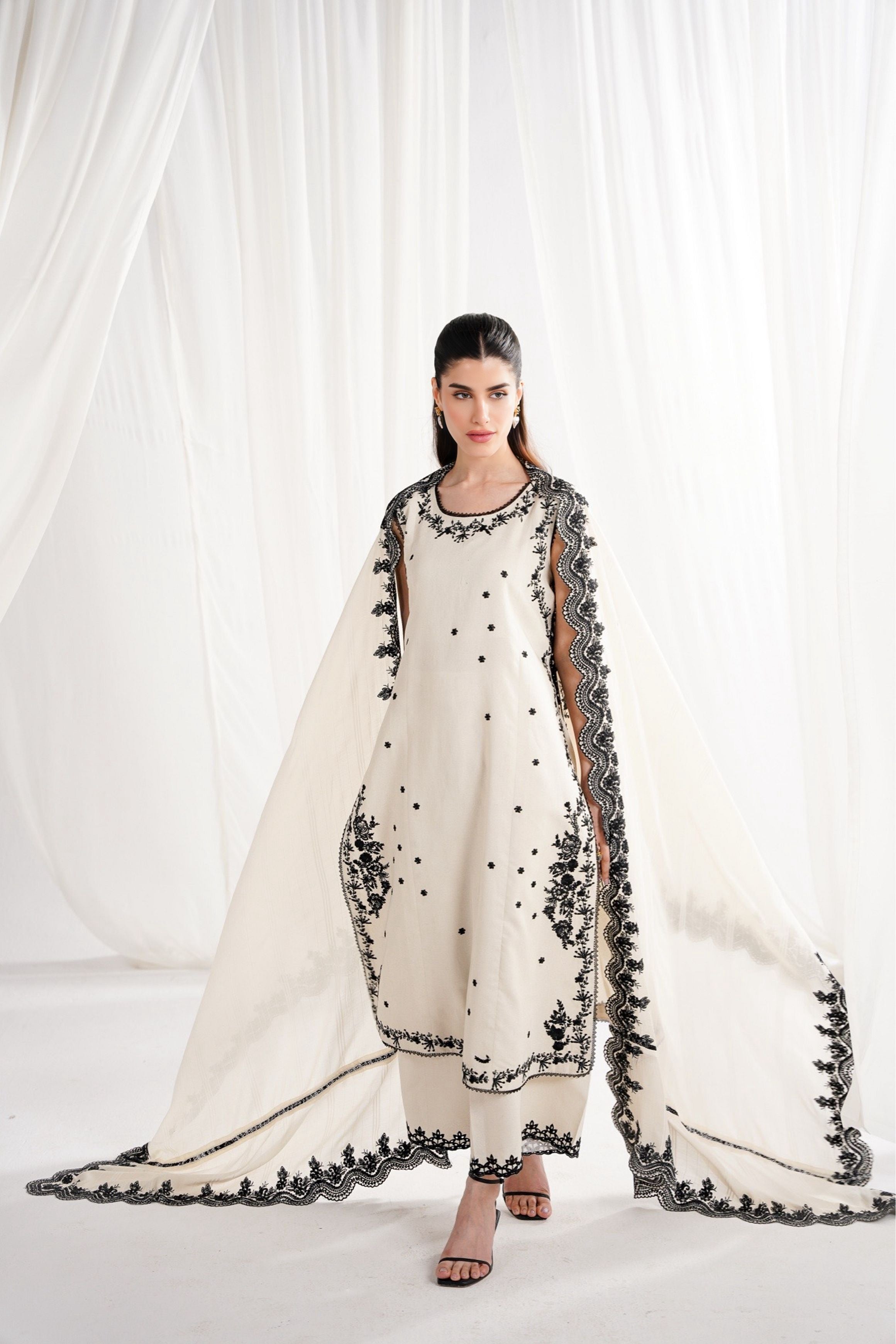 Introducing an off-white masterpiece that exudes timeless elegance. This ensemble features a summer karandi straight shirt, intricately adorned with black thread and tilla embroidery, creating a striking contrast. Modern side tassel closures add a chic, contemporary touch. Paired with a heavy embroidered dupatta, embellished with detailed black embroidery all around, it radiates sophistication. The look is completed with culottes, featuring delicate Schiffli hem embroidery, adding a graceful allure to this refined creation.