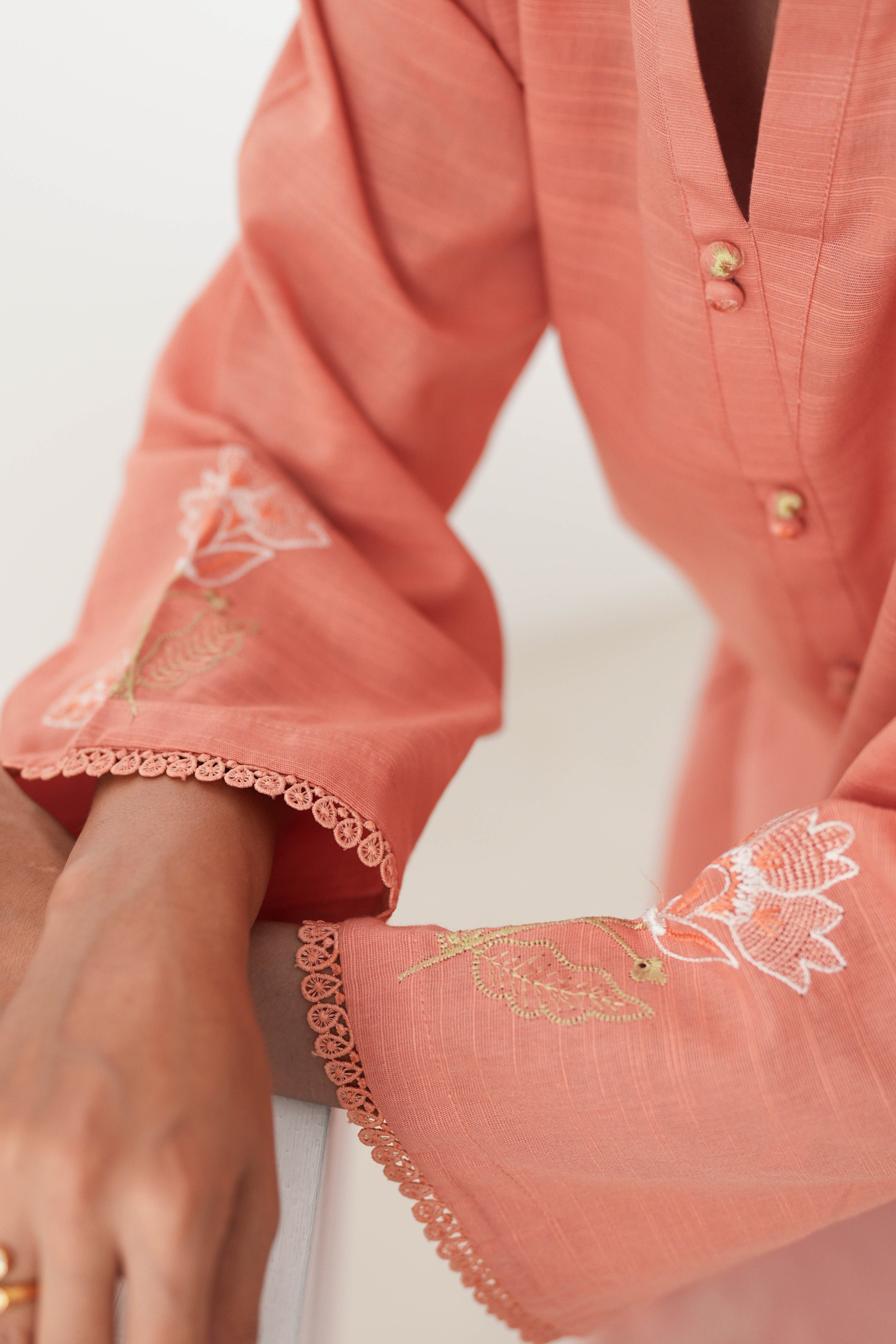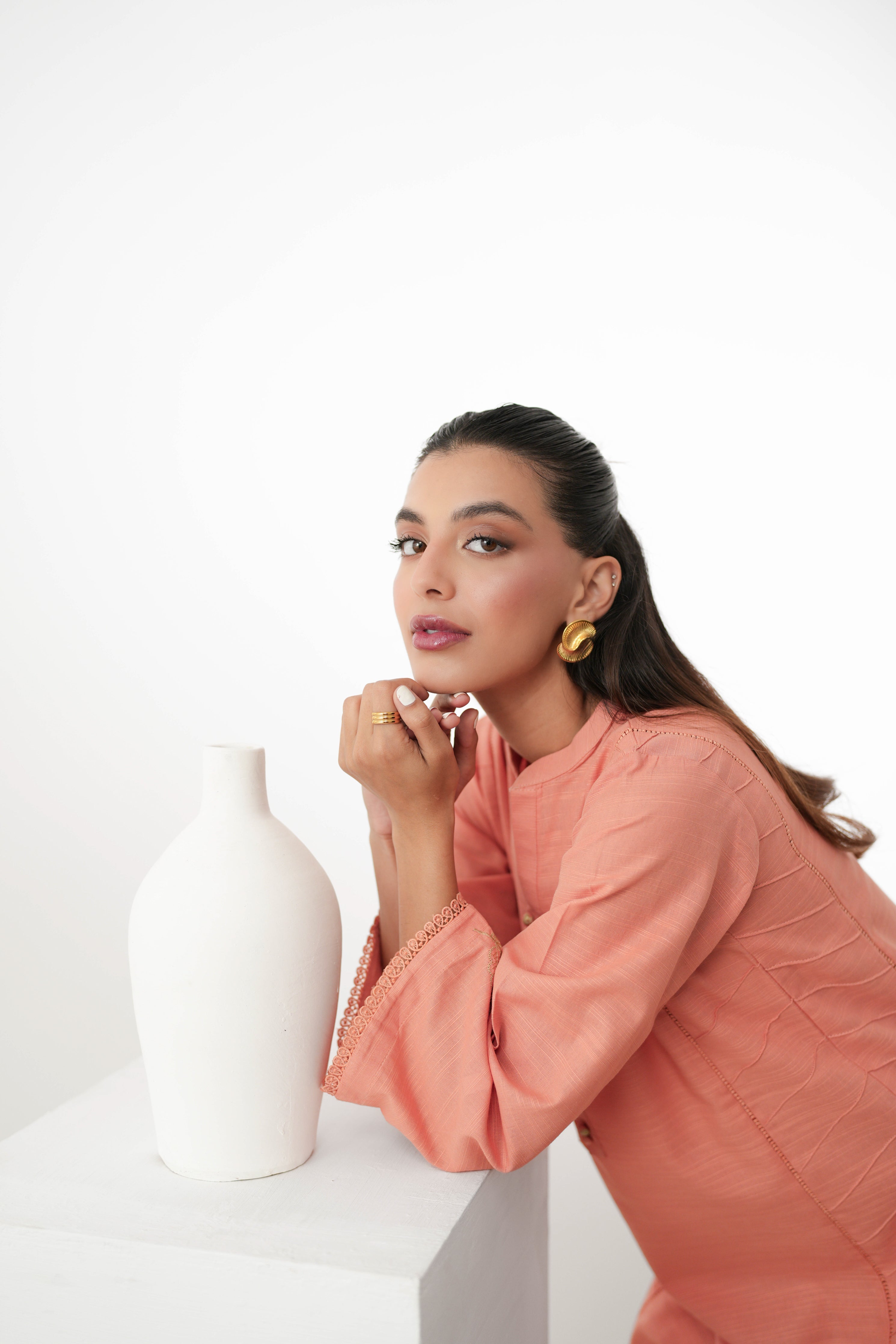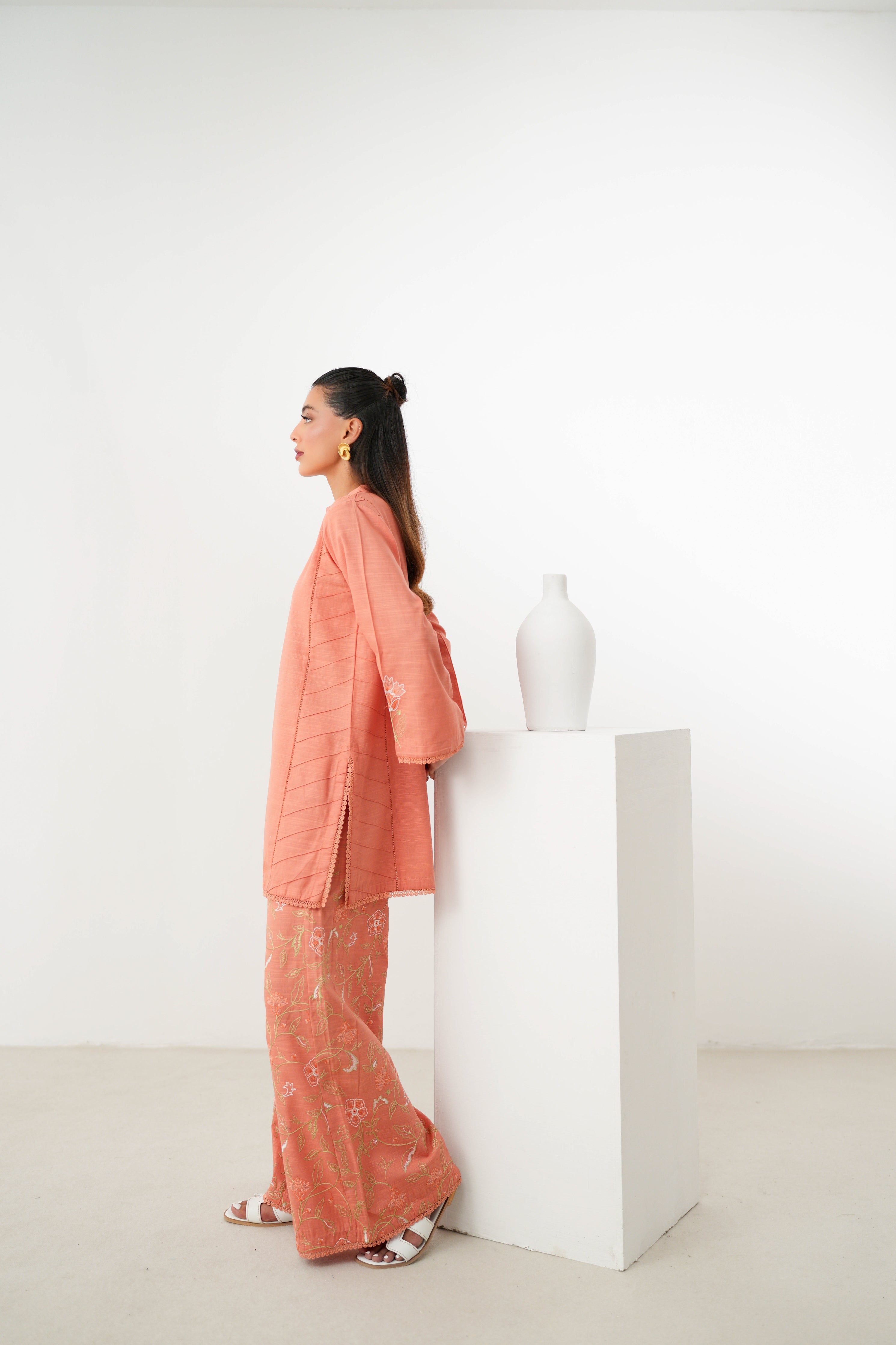 Our peach soft khaddar outfit combines modern style with classic elegance. It features a stylish ban collar and embroidered buttons for a refined look. Pintex detailing on the panels adds to the flattering fit, while delicate lace on the shirt and sleeves gives it a feminine touch. The embroidered sleeves and bell-bottom trousers add a playful yet classy vibe. With its short-length shirt, this outfit is perfect for showing off your unique style at any event. Enjoy the luxurious comfort of soft khaddar while making a statement in this beautiful ensemble.