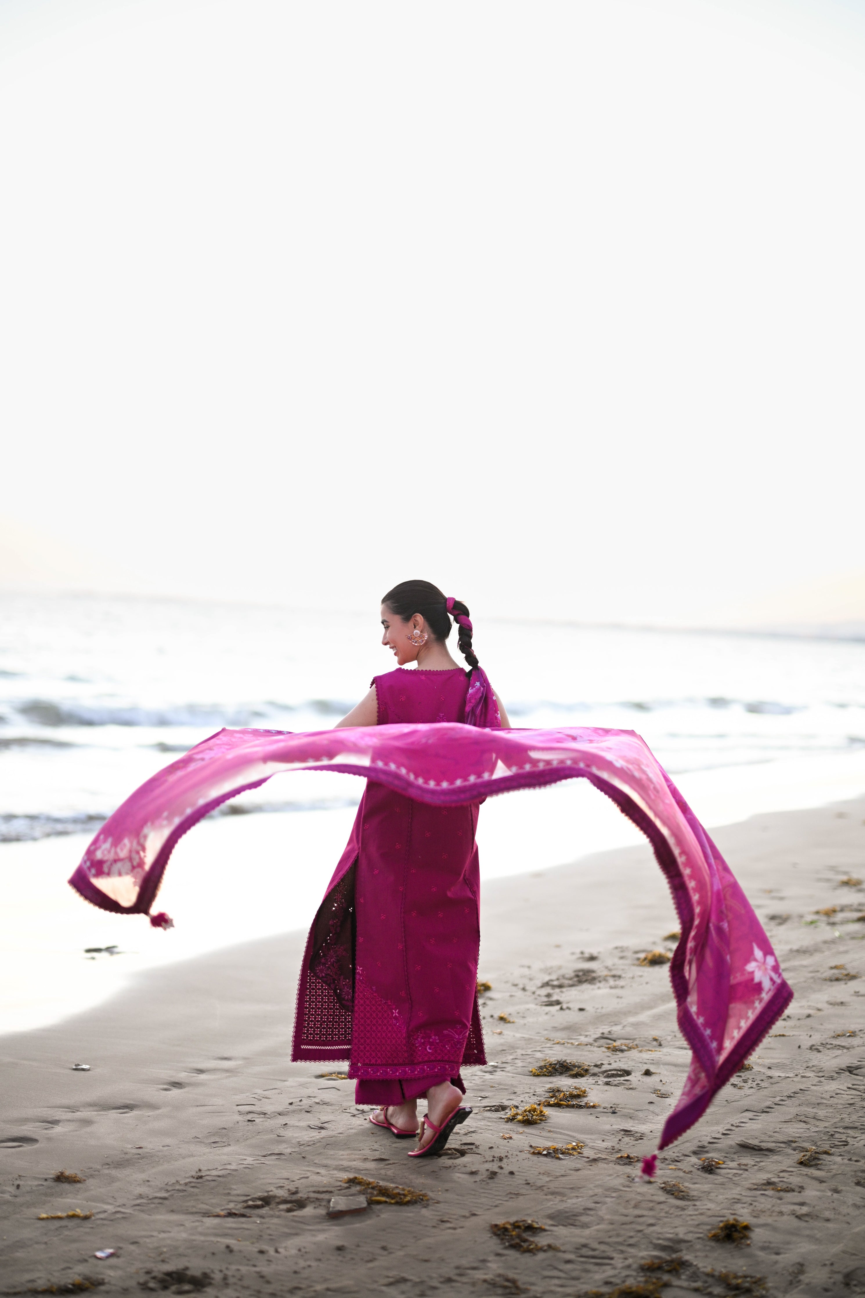 Behold the captivating majesty of 'Fuchsia’, where a bold, fuchsia shade steals the spotlight, expertly adorned with delicate shifilli that illuminates the fabric with captivating refinement. Adorned with intricate floral embroideries and patterns, elevated by exquisite design inspired by nature’s intricate beauty detailing .The borders exceptional artistry enthralls the senses, exuding an irresistible charm that lingers forever. Paired with sumptuous silk dupatta completes the ensemble,creating an impression that is both captivating and effortlessly chic.