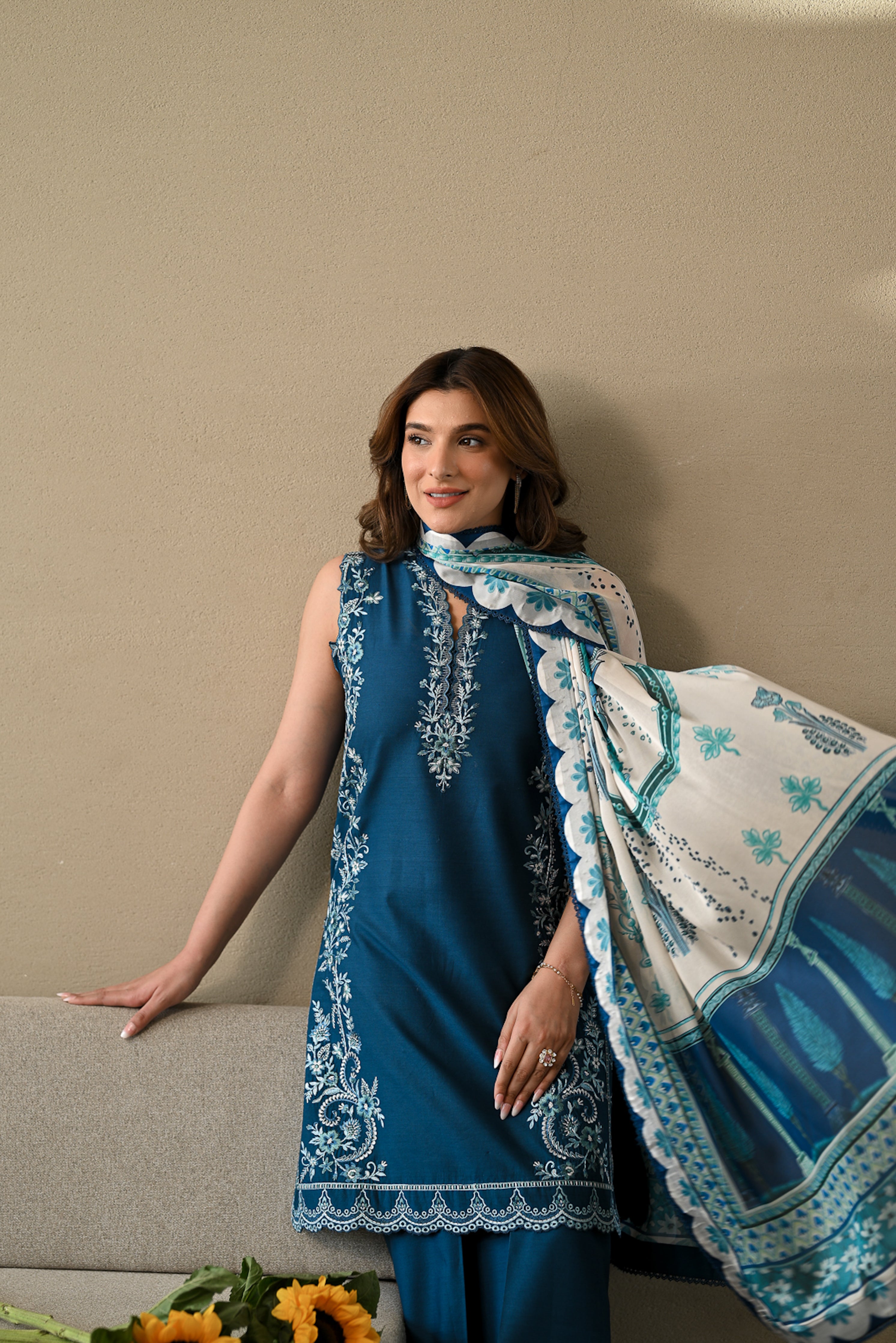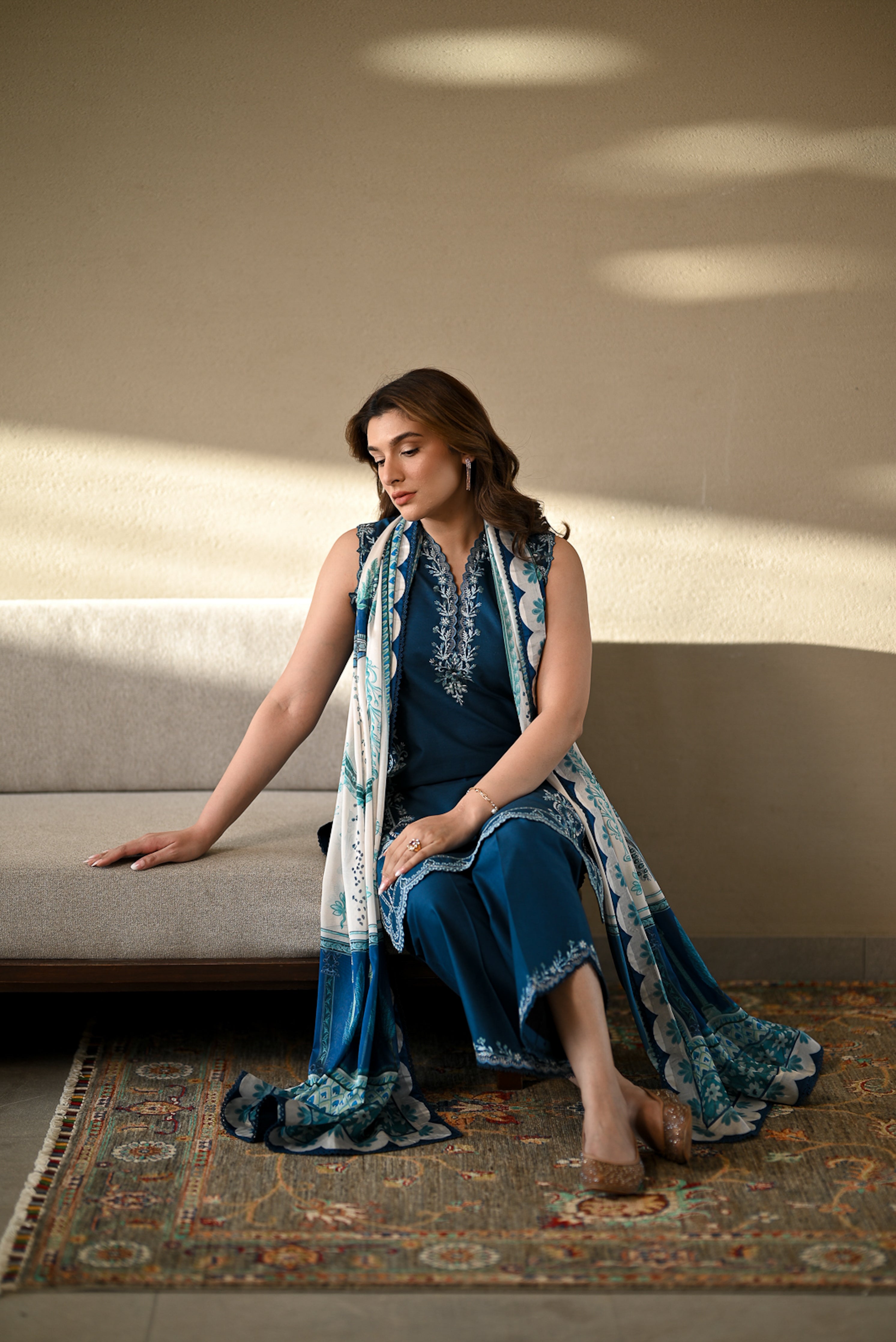 Step into sophistication with this stunning teal blue embroidered scalloped lawn shirt. The short shirt features delicate embroidery in shades of blue, designed with a flattering v-neckline that exudes elegance. Paired with a printed silk dupatta, it boasts a lace finish for a refined and graceful touch. The embroidered curved hem culottes, with their unique round hem design, add a contemporary twist to the traditional look. This ensemble beautifully combines intricate embroidery with modern styling, perfect for any occasion.