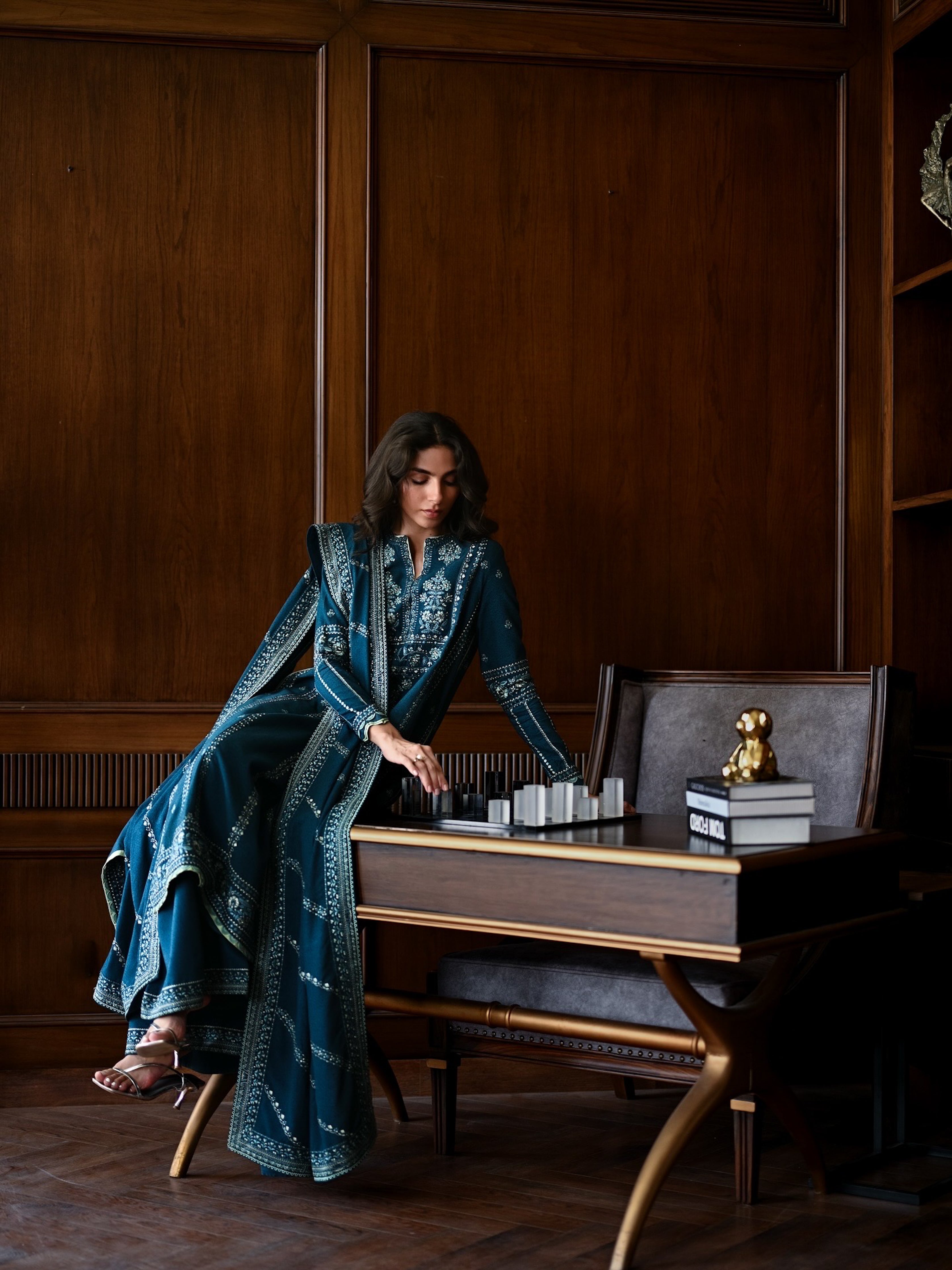 This three piece karandi suit is in a vibrant teal blue color. The ensemble features a straight-cut kameez (shirt) that is embroidered with intricate, likely white or off-white thread. The embroidery patterns appear to be a mix of geometric and floral motifs that cover the front of the shirt and along the hem. The suit is completed with matching, wide-leg trousers (shalwar) and a dupatta featuring a border with the same detailed embroidery, creating a coordinated and polished look. This set has a classic, timeless feel that is both stylish and traditional.