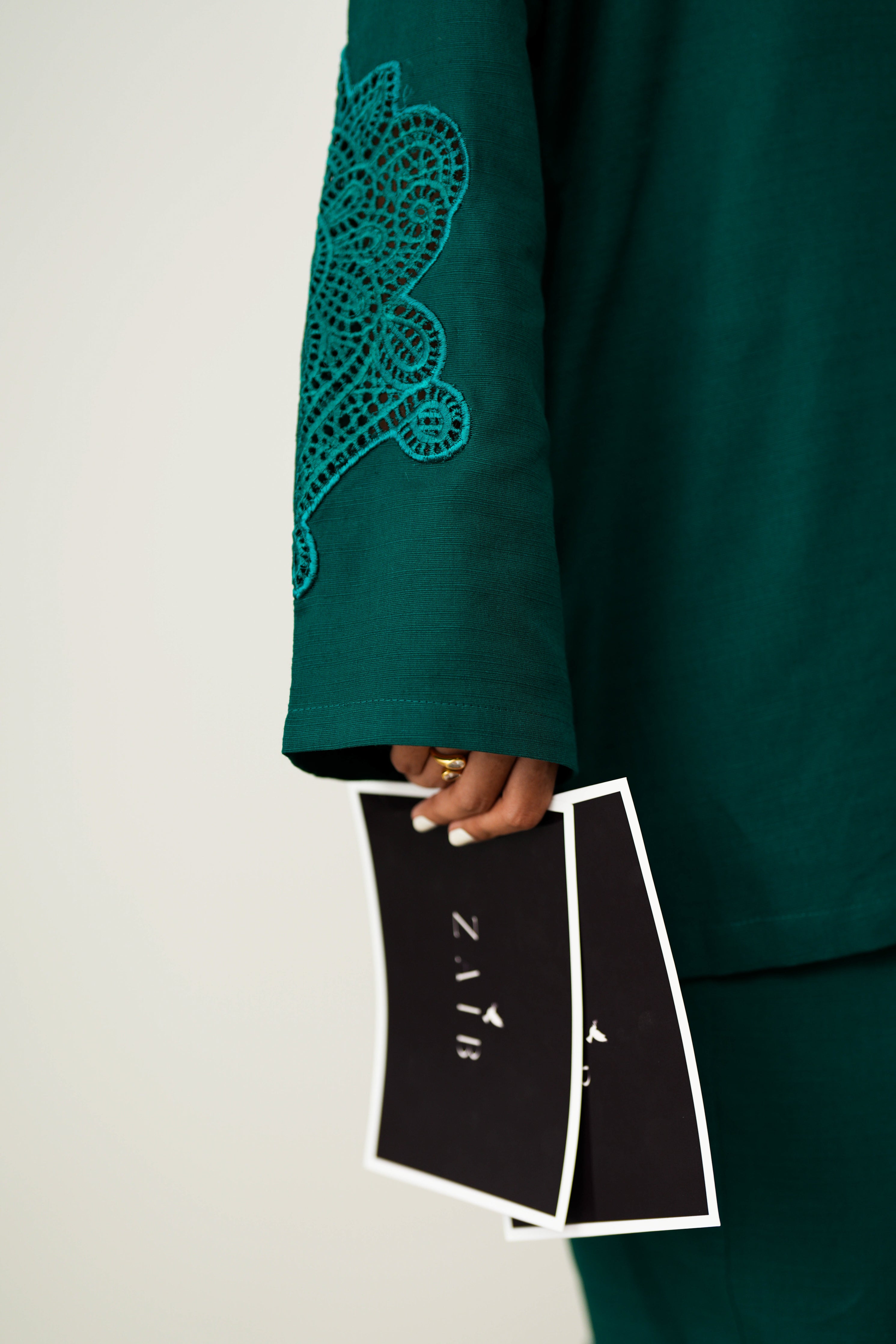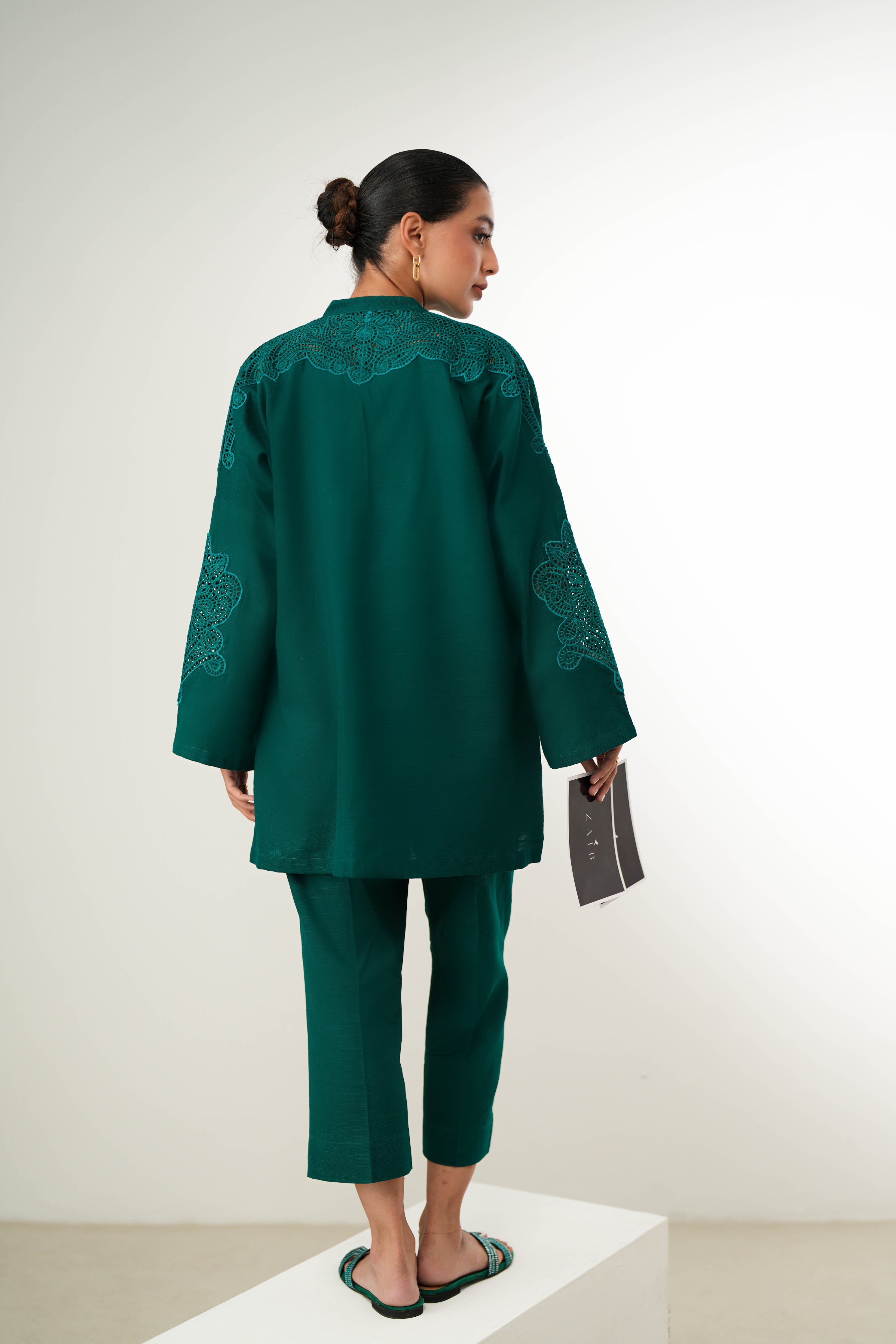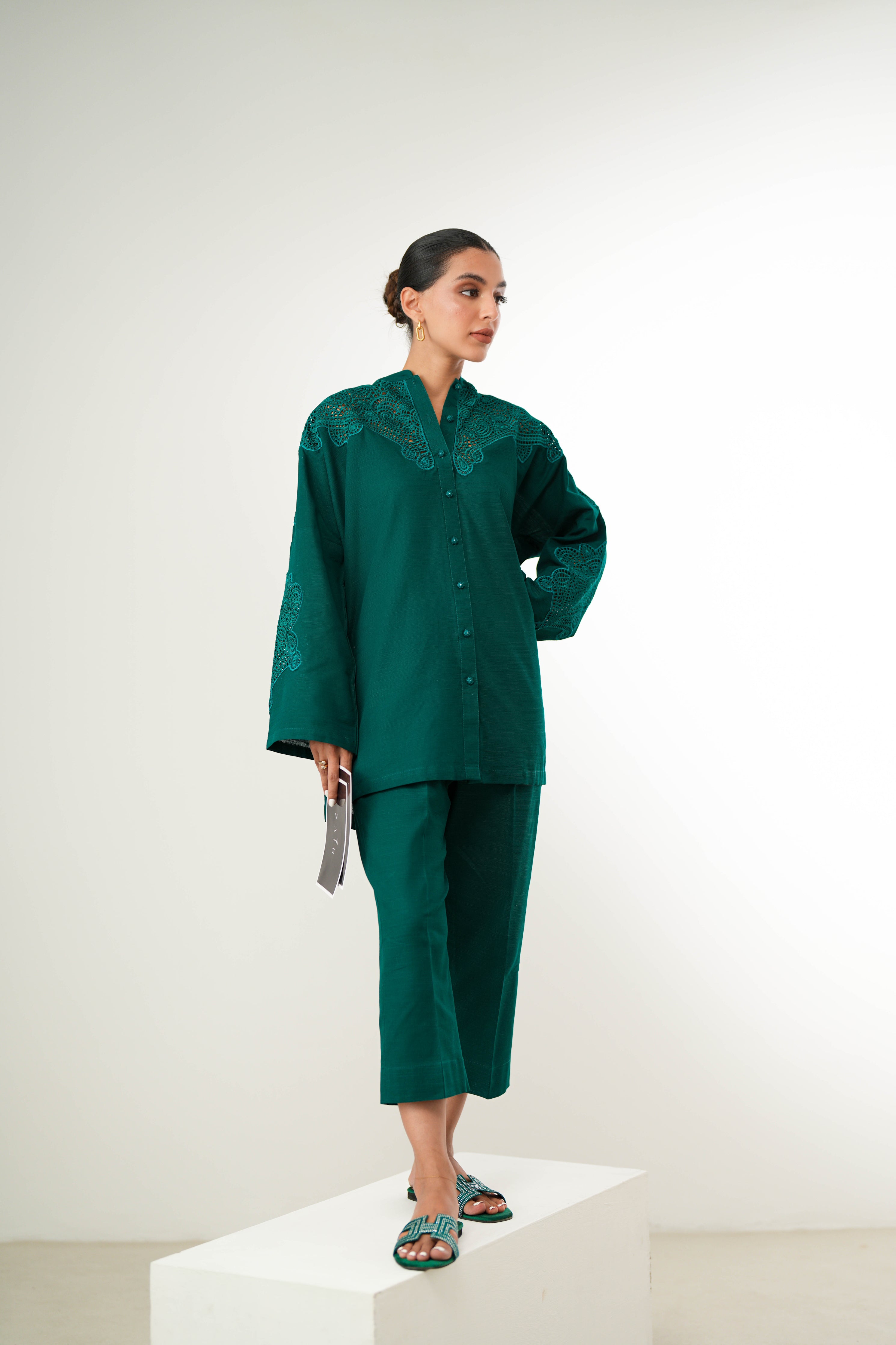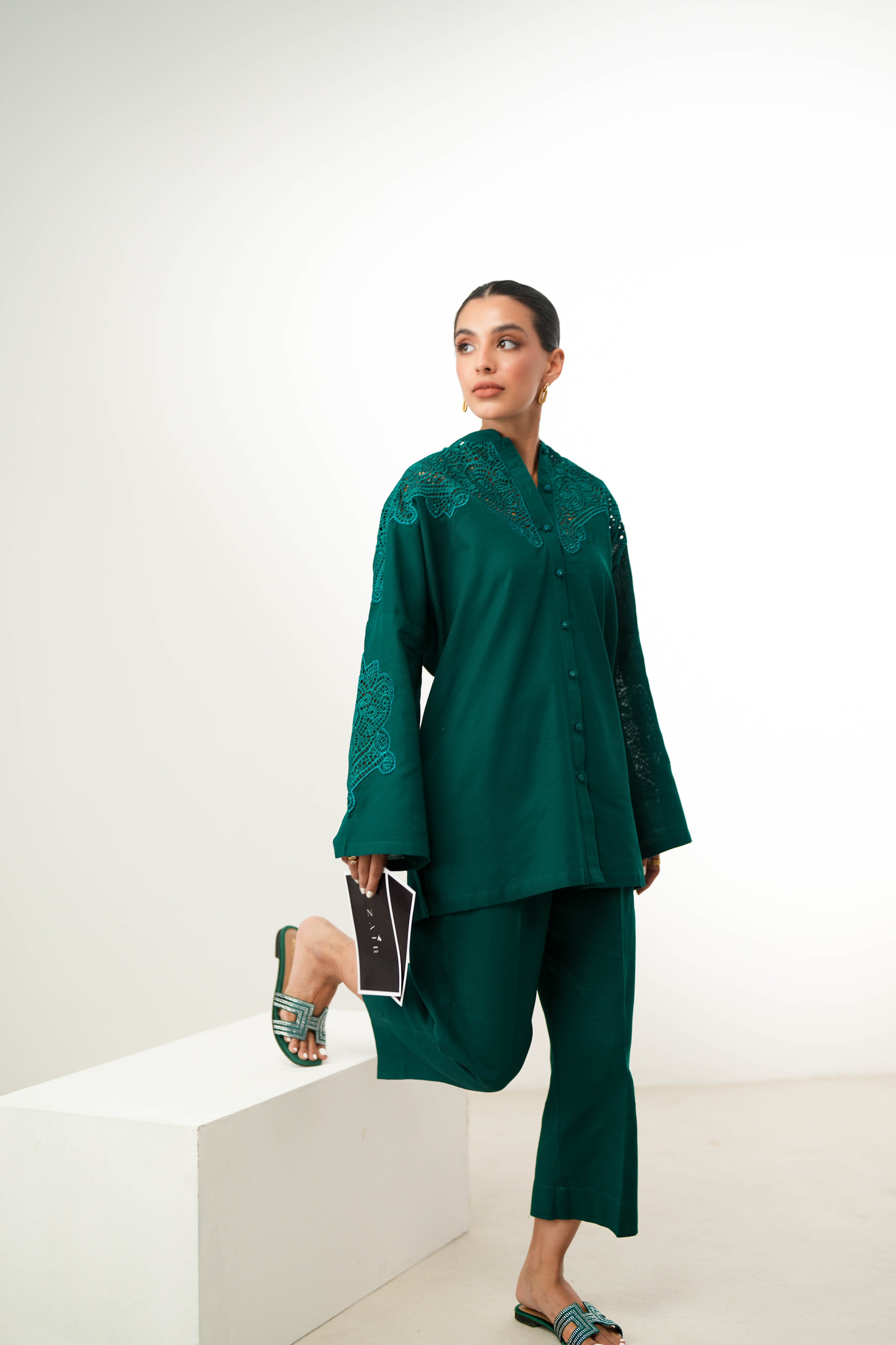 This chic teal green ensemble features exquisite dissolving embroidery, elegantly crafted on the shirt, sleeves, back, and neckline. The button-down shirt boasts a loose fit with drop shoulders and a refined ban collar, exuding effortless sophistication. Paired with stylish culotte pants, this outfit offers a perfect blend of contemporary design and graceful artistry.